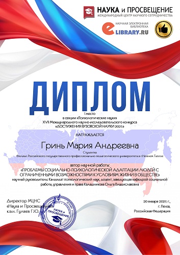 Уже в январе 2021 года студентка второго курса социально-гуманитарного факультета, направление подготовки – социальная работа, профиль «Управление и предпринимательство в социальной сфере» Мария Гринь (руководитель – О. В. Калашникова) приняла участие в Международном научно-исследовательском конкурсе «Достижения вузовской науки 2021», который проводился в Пензе центром «Наука и просвещение» (секции «Психологические науки»). Студенткой были представлены результаты исследовательской деятельности по проблеме «Проблемы социально-психологической адаптации людей с ограниченными возможностями здоровья к условиям жизни в обществе».