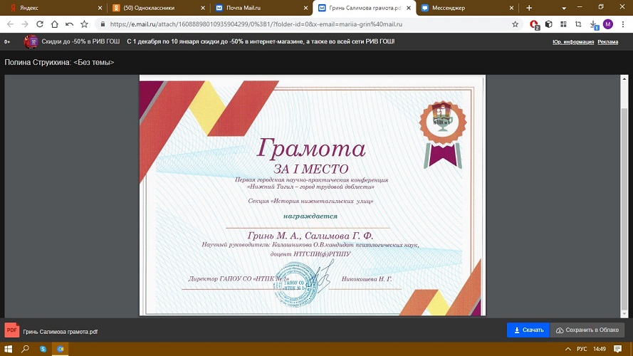 На секции «Истории нижнетагильский улиц» работа студенток второго курса направления подготовки социальная работа профиль «Управление и предпринимательство в социальной сфере» Марии Гринь и Галины Салимовой получила признание специалистов и студентов и заняла первое место по результатам работы секции.