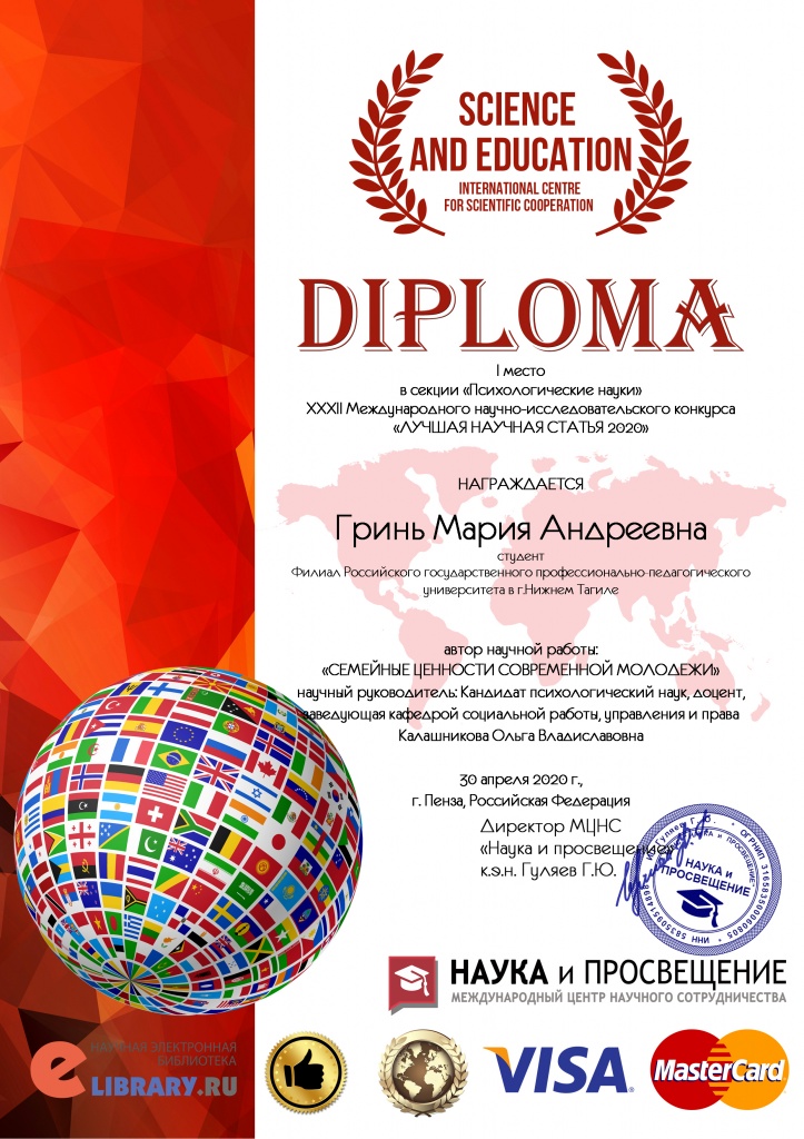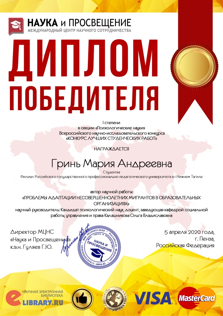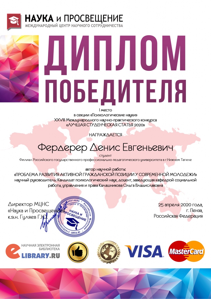 Студенты первого курса социально-гуманитарного факультета, направление подготовки – социальная работа, профиль «Управление и предпринимательство в социальной сфере» Мария Гринь и Денис Фердерер (руководитель – О. В. Калашникова) приняли участие в Международном научно-исследовательском конкурсе «Лучшая научная статья 2020», «Лучшая студенческая статья – 2019» и Всероссийском научно-исследовательском конкурсе «Конкурс лучших студенческих работ», проводимых в Пензе центром «Наука и просвещение» (секции «Психологические науки») и стали его победителями.