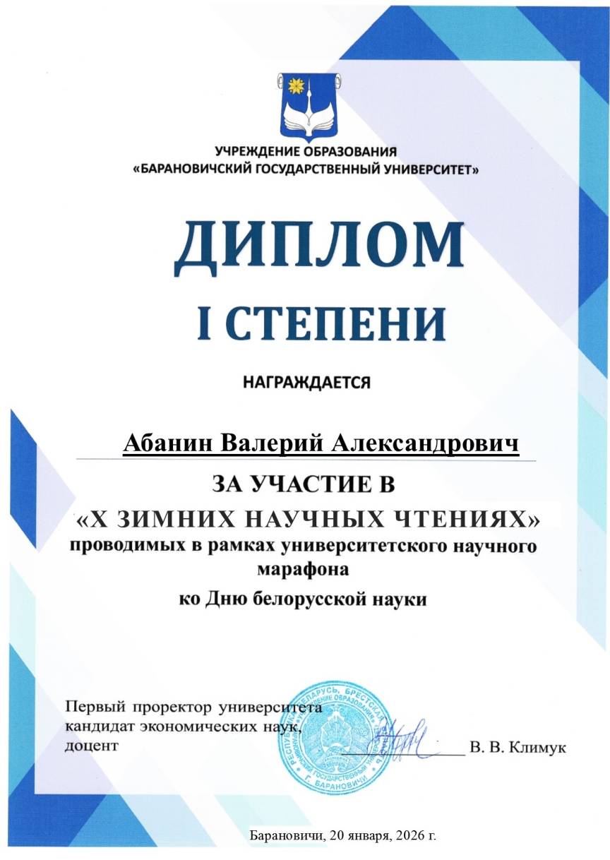 Студенты социально-гуманитарного факультета Валерий Абанин и Никита Потапов под руководством декана СГФ А. М. Олешковой приняли участие в Х Зимних научных чтениях, которые прошли 20 января 2025 года в Барановичском государственном университете (республика Беларусь). По итогам мероприятия Валерий Абанин получил диплом I степени, а Никита Потапов – диплом III степени.