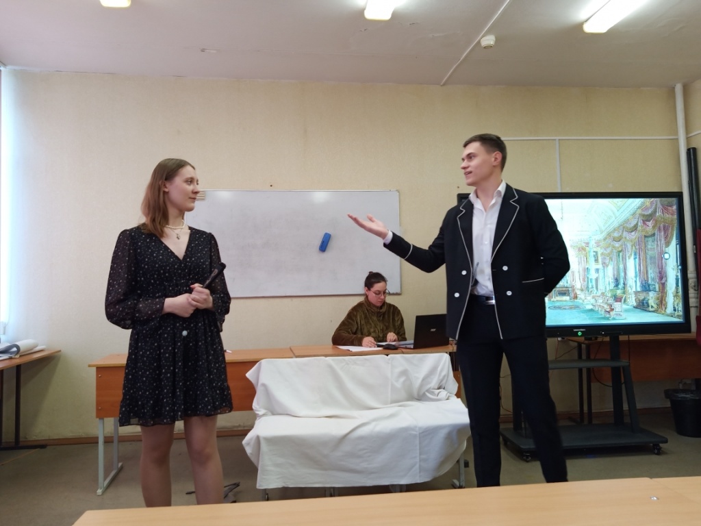 Г. А. Авдеева, Ю. В. Несынова и И. Л. Чижова увлеченно следили за происходящим на импровизированной сцене. Каждый из студентов-актеров выложился по полной. Всю бурю эмоций своих персонажей передали Дарья Москаленко (Миллер, отец Луизы), Диана Десятова (фон Вальтер, отец Фердинанда). Абсолютно органична была в роли Луизы Елизавета Никифорова, которая на этот раз в полной мере раскрыла свой актерский потенциал. Прекрасно воплотила образ леди Мильфорд, утонченной, кокетливой и страдающей одновременно, Анна Новикова. Очень убедительна была в роли главного интригана пьесы – Вурма – Кристина Кузьмина. Невольно вспомнился Полоний из «Гамлета», который также очень удался Кристине. Образ нелепого, глуповатого гофмаршала фон Кальба достался Диане Патрушевой. Было даже немного страшно за Диану – Кальба, когда на нее обрушился гнев снедаемого ревностью Фердинанда.