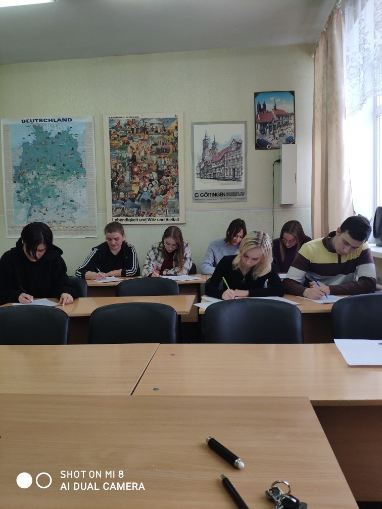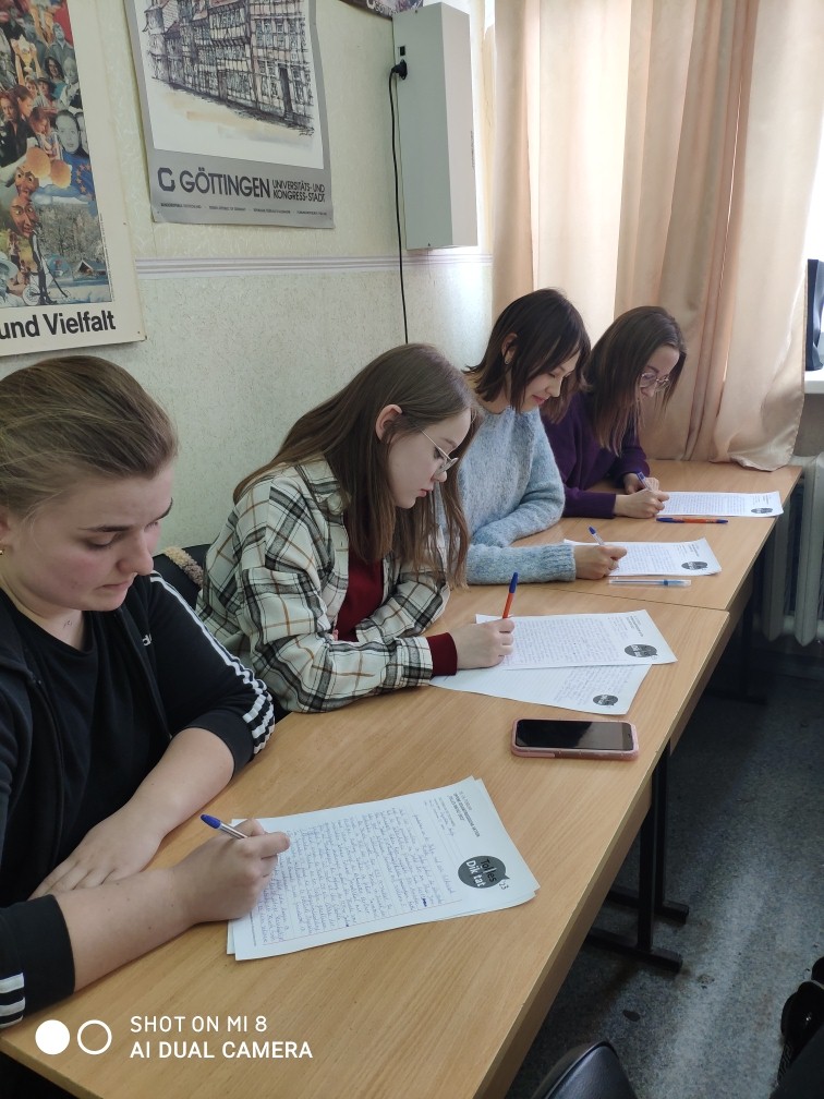 Целью акции является популяризация немецкого языка и мотивация к его изучению, а также развитие культуры грамотного письма на немецком языке и поддержка международного сотрудничества. Акция стала доброй традицией в системе общего образования, и с каждым годом масштабы ее растут. Так, в прошлом году в ней приняли участие более 70 000 человек из 35 стран мира. В нашем вузе традиционно принимают участие все студенты, изучающие немецкий язык – 57 студентов ФФМК 3–4 курсов.