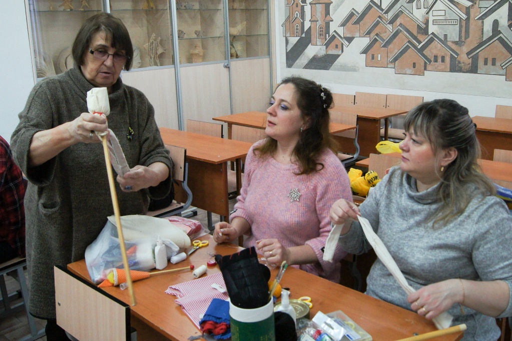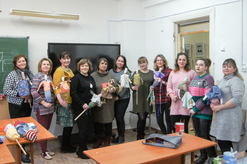 Факультет художественного образования организовал для педагогов ДОУ и педагогов художественных школ творческую встречу с педагогом-художником, искусствоведом Людмилой Алексеевной Ивановой. Тема разговора – «Художественная обработка текстиля как форма художественно-эстетической деятельности детей в ДОУ» – переросла в мастер-класс по изготовлению куклы-балаганчик «Петрушка». Каждый из участников встречи смог узнать историю появления куклы и под руководством педагога выполнить затейливую куклу. Мастер-класс организован в рамках взаимодействия филиала РГППУ в г. Нижнем Тагиле с Муниципальным ресурсным центром по введению ФГОС ДОУ по направлению «Художественно-эстетическое развитие детей дошкольного возраста». Очередная встреча пройдет 17 февраля на факультете художественного образования (пр. Мира, 25) и будет посвящена роли детской литературы в развитии детей дошкольного возраста. На семинаре будут затронуты следующие темы: