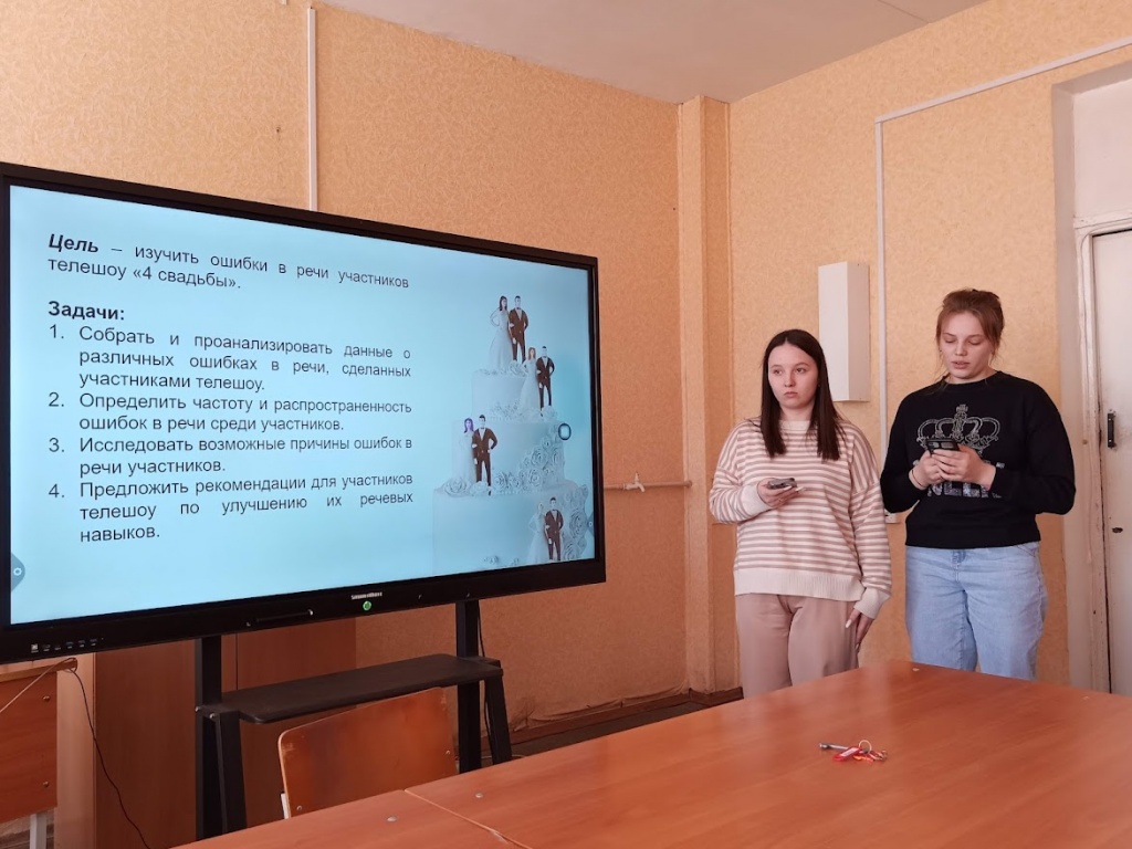 Студенты приготовили разнообразные содержательные доклады. Так Мария Клебановская, Елизавета Пятыгина и Нина Пырина рассмотрели случаи отклонения от языковой нормы на материале шоу «Четыре свадьбы». Они собрали материал, проанализировали ошибки участников шоу, указали их возможные причины и даже предложили рекомендации по улучшению речевых навыков. Присутствующие на занятии отметили, что современные СМИ вовсе не являются образцом для речевого подражания, что было характерно для советского телевидения. Скорее, напротив, в различных ток-шоу если и не приветствуется нарушение языковой нормы, то не обращается внимание на подобные отклонения.