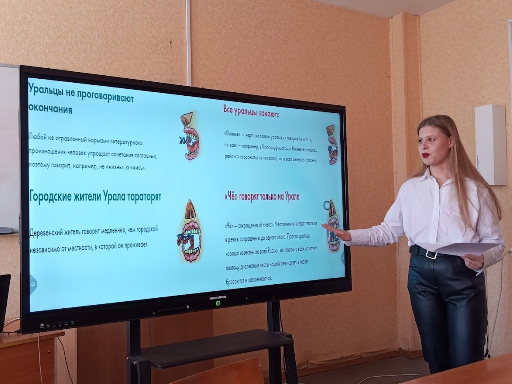 Варвара Волкова и Александра Казаринова обратились к другой теме: проанализировали речевые особенности жителей Уральского региона, в частности, произносительные и лексические. Студентки изучили теоретический аспект проблемы, в первую очередь обратили внимание на влияние диалекта. Кроме того, докладчики собрали лексический материал и оформили его в виде словарика, правда, туда попали не только диалектизмы.