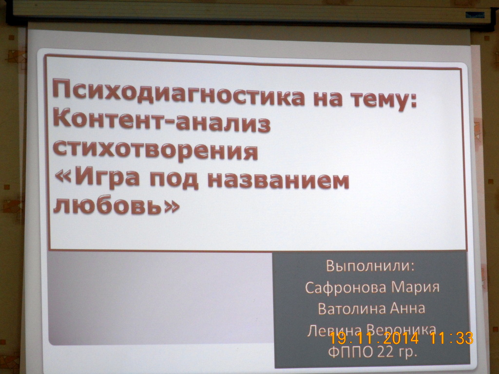 Яркий, эмоциональный рассказ студентов четвертого курса М.Бурлаковой, Р.Гашимовой, К.Галышевой о том, как они изучали дисциплину «Методы коррекционно-развивающей работы психолога» продемонстрировал их творческий, исследовательский подход в освоении этого предмета. Не меньший интерес вызвали выступления студентов второго курса «Исследование личностных характеристик студентов с помощью метода контент-анализа» (М.Сафронова, А.Ватолина) и «Метод интервью в изучении интересов дошкольников» (О.Евдокимова), подготовленные в рамках изучения дисциплины «Психолого-педагогическая диагностика (с практикумом)» (преподаватель Рыбакова Л.А., к. психол. н., старший преподаватель кафедры психологии и педагогики дошкольного и начального образования).