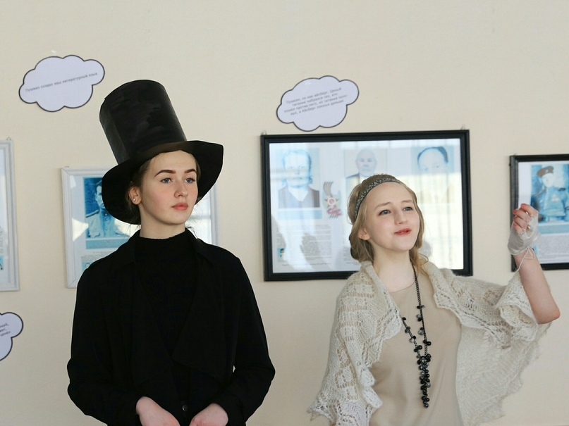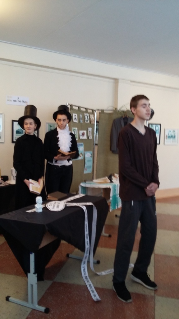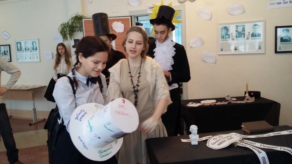 Как и обещали организаторы, скучать в этот день никому не пришлось. С утра всех приходящих в фойе школы встречали дамы в кринолинах и кавалеры во фраках и котелках пушкинской эпохи. После зачисления желающих в Первый Пушкинский Царскосельский лицейский класс началась презентация литературной инсталляции «Пушкин – наше все?», разместившейся в рекреации 2-го этажа. В соответствии с трендом современных музейных технологий, призванных вовлекать посетителей в сотворчество, сопереживание события, лицеистам было предложено создать свой арт-объект – цилиндр-рефлексию пушкинского четверостишья применительно к проблемам сегодняшнего дня.