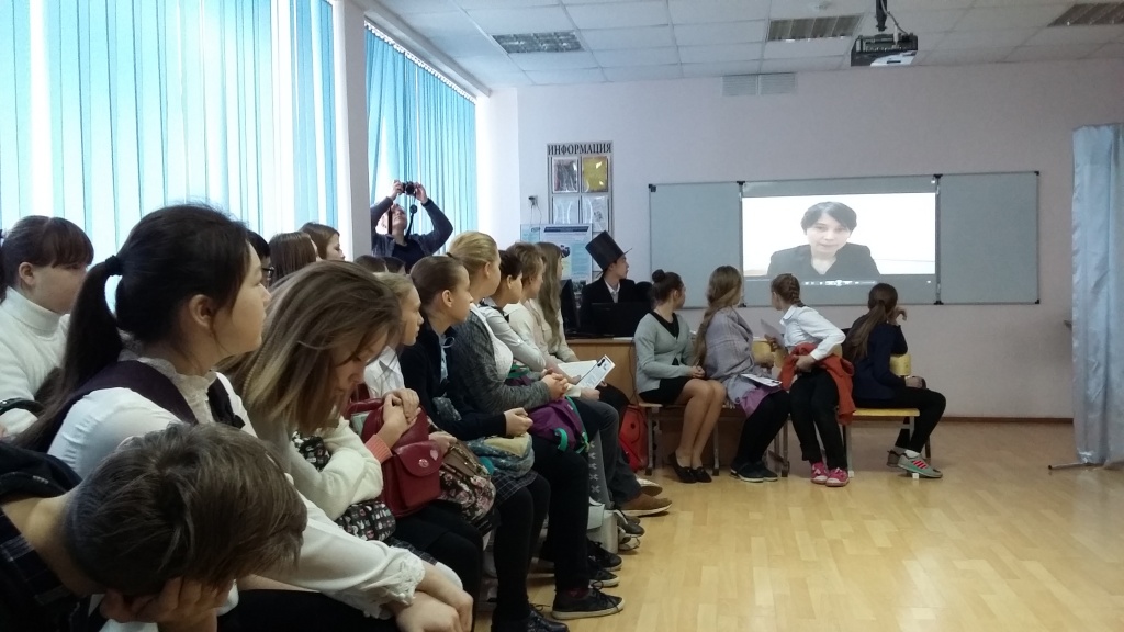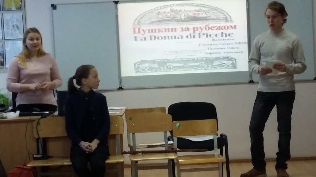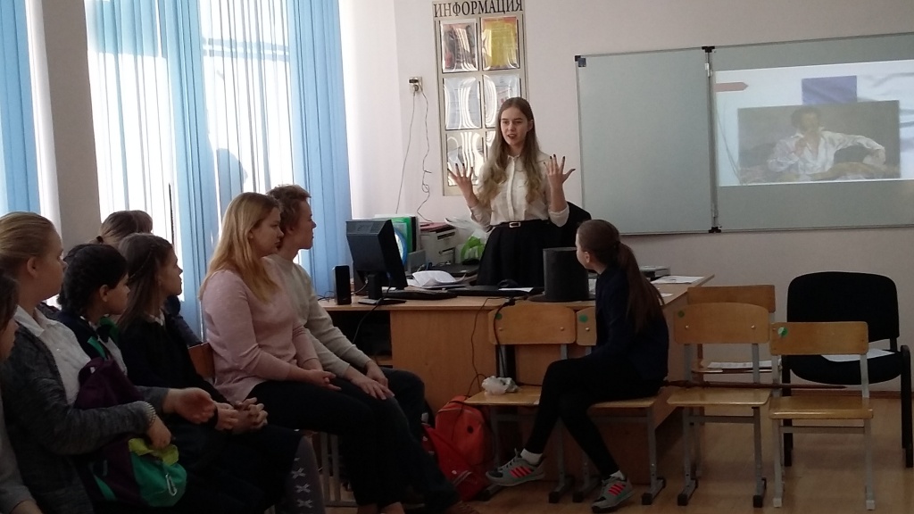 После небольшой переменки, когда к участникам обратилась Камила Мориак, тагильский поэт и давний друг школы, начались занимательные уроки. Урок литературной истории провели Кристина Фесик и Мария Анчугова, студенты 1 курса СГФ, рассказавшие лицеистам о Пушкине-историке, и Ольга Алексеева, студентка 2 курса ФФМК. С ней лицеисты совершили виртуальное путешествие по пушкинским местам: побывали в Михайловском, в последней квартире поэта, на набережной реки Мойки, 12, и на Черной речке. Урок иностранной словесности начался с истории перевода творчества Пушкина на языки мира, которую рассказали Ольга Тихонова и Александр Зырянов, студенты 2 курса ФФМК. Продолжила урок Полина Шушарова, студентка 1 курса ФФМК, познакомив слушателей с личными наблюдениями о том, как Пушкина почитают во Франции. Самые внимательные лицеисты, быстрее справлявшиеся с тестовыми заданиями, подготовленными студентами, получали сладкие призы. Следующий по расписанию урок искусств провел заслуженный художник РФ Владимир Зуев. Он презентовал выставку экслибрисов «Наш Пушкин», над которой студенты ФХО работали два года и успешно ее представили на Международном конкурсе экслибрисов в Москве осенью 2018 года.