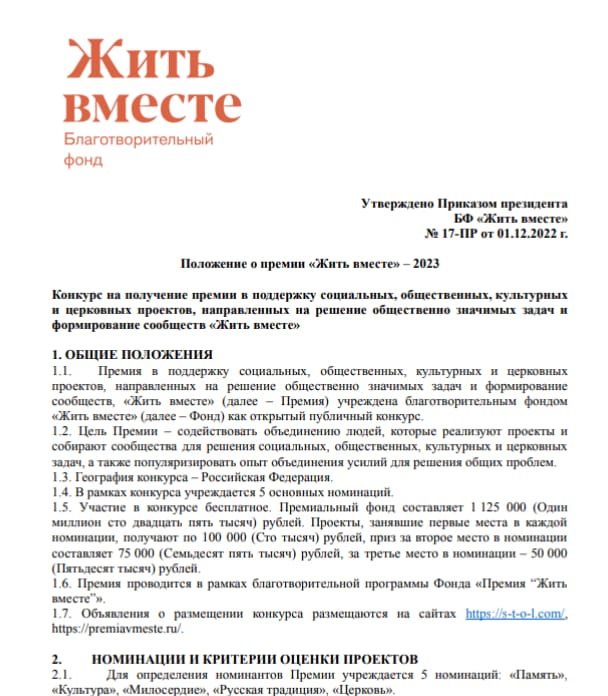 Премия «Жить вместе» направлена на поддержку социальных, культурных и церковных проектов, призванных решить общественно значимые задачи.