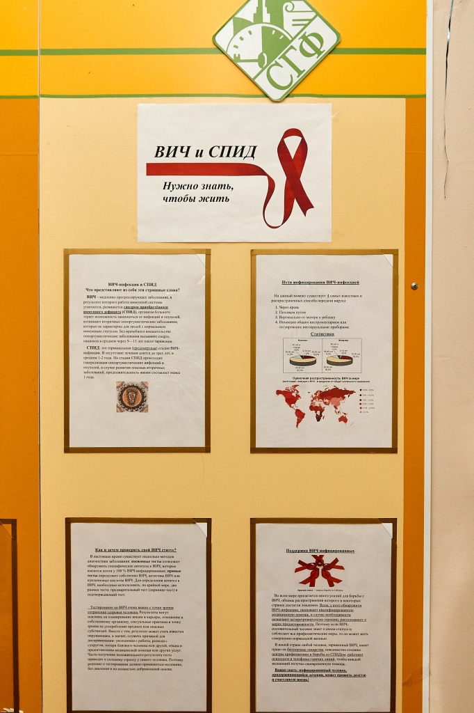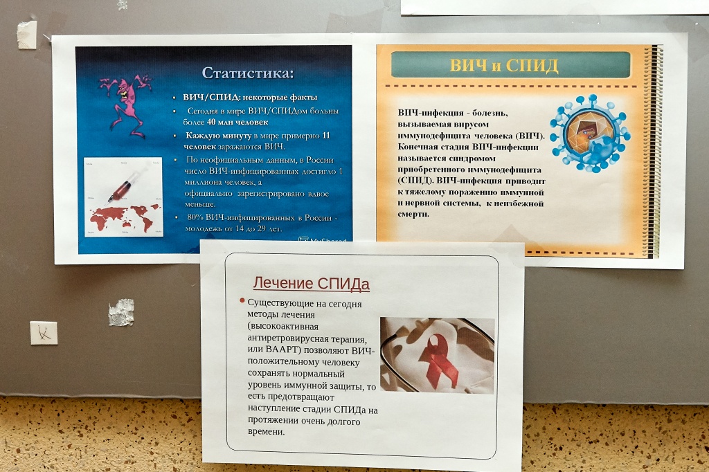 При оформлении факультетских стендов студенты попытались ответить на вопросы: Что такое ВИЧ? Что такое СПИД? Как передается заболевание? Что нужно делать, чтобы не заразиться? Что делать, если у вас обнаружен ВИЧ? И, конечно же, смогли дать и ответ: «Главное – без паники! Предупрежден – значит вооружен». Важная и серьезная проблема была отражена студентами в доступной и наглядной форме. Это и есть одна из основных целей данной акции, которая достигается массовым информированием.