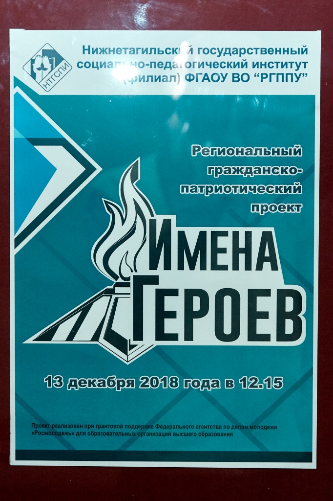 13 декабря в выставочном зале музея НТГСПИ на большой перемене состоялась презентация передвижной выставки, организованной в рамках активной работы регионального гражданско-патриотического проекта «Имена Героев», воплотившегося в жизнь в стенах нашего института.