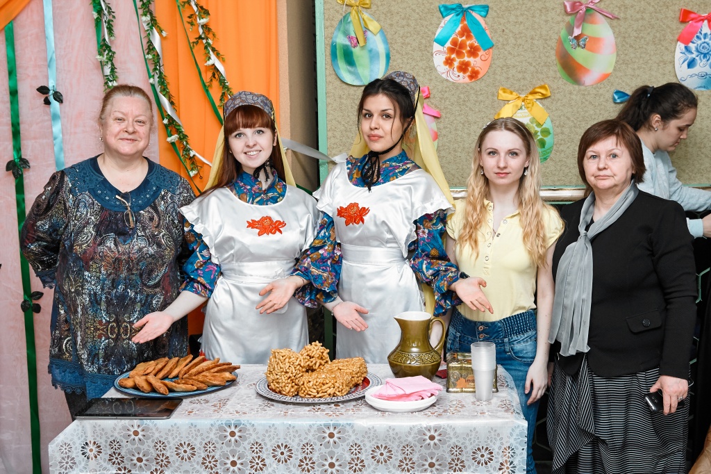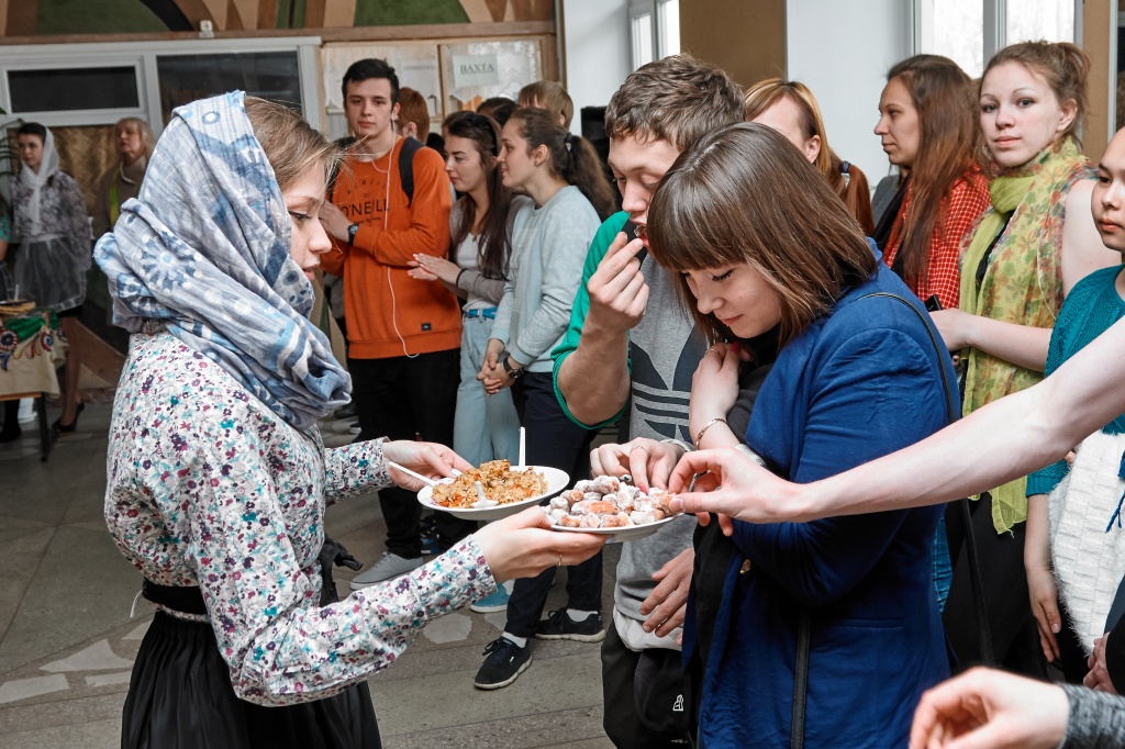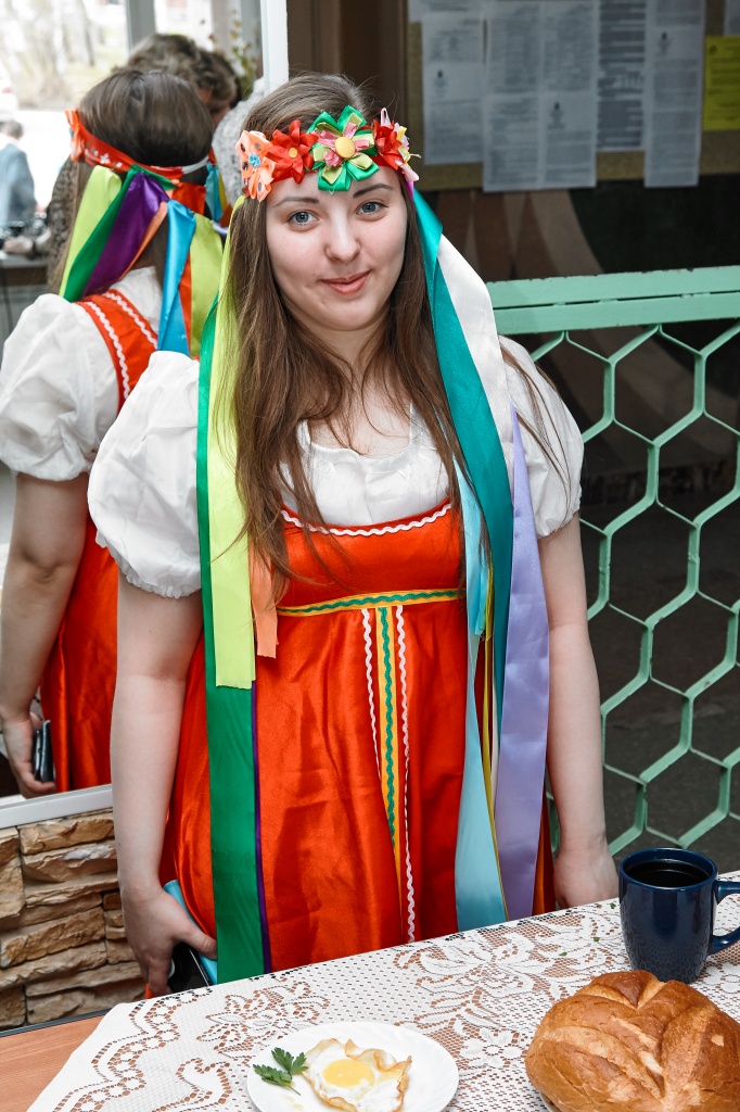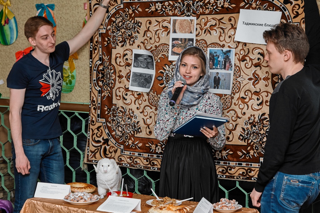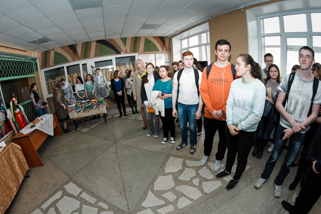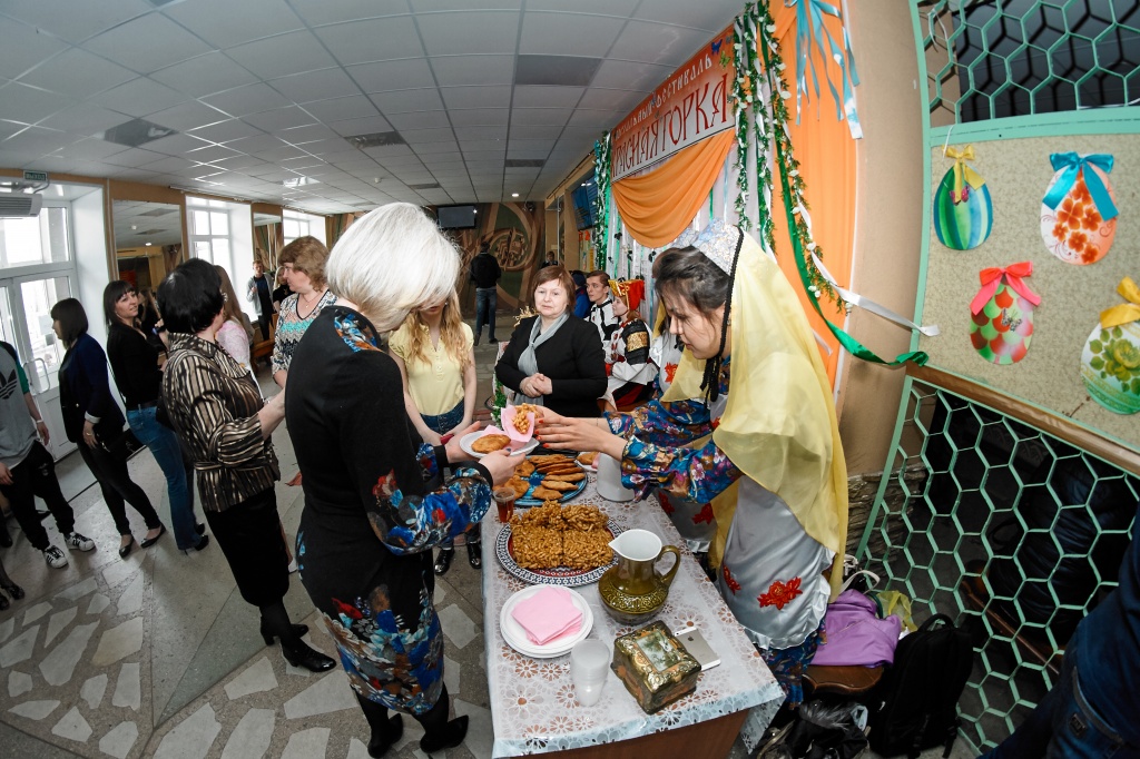 Основное действие торжественного открытия пасхального праздника состоялось в 12:10. В холле института была представлена национальная свадебная атрибутика. Каждый факультет накрыл стол в соответствии с выбранной нацией.