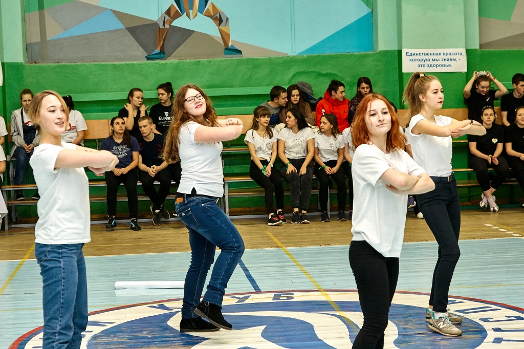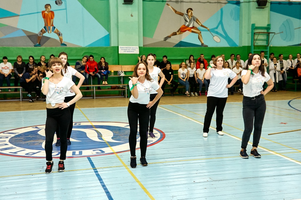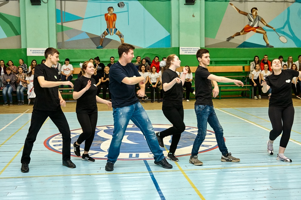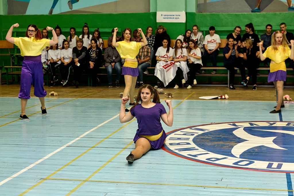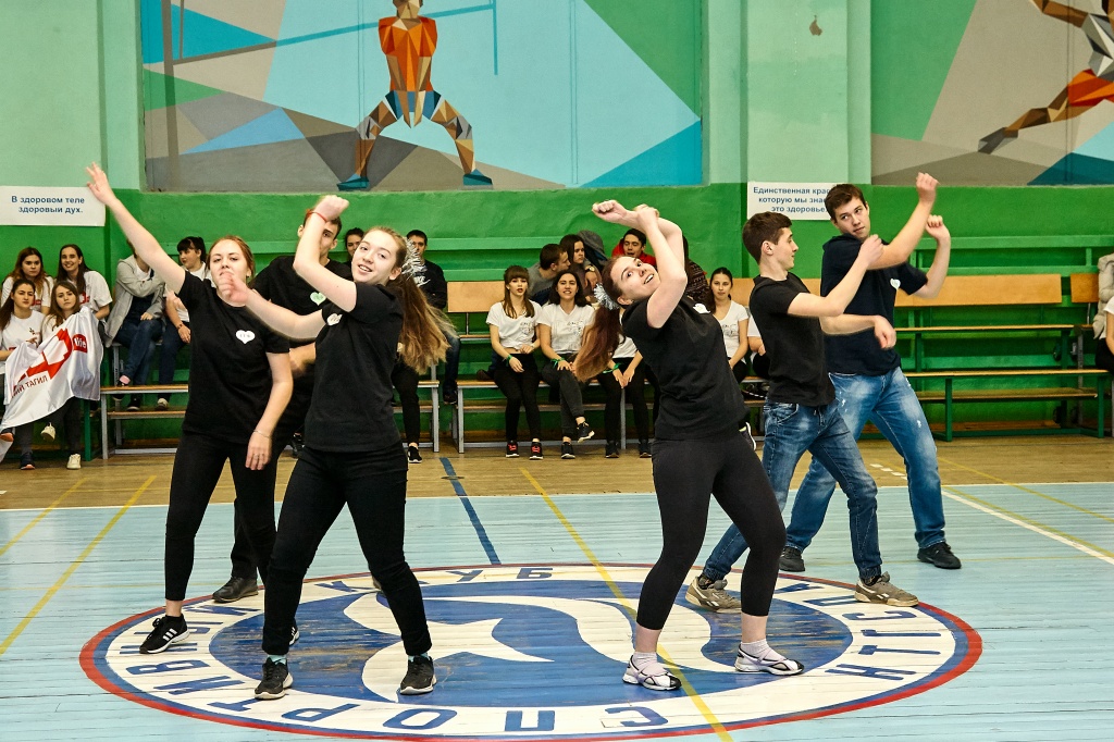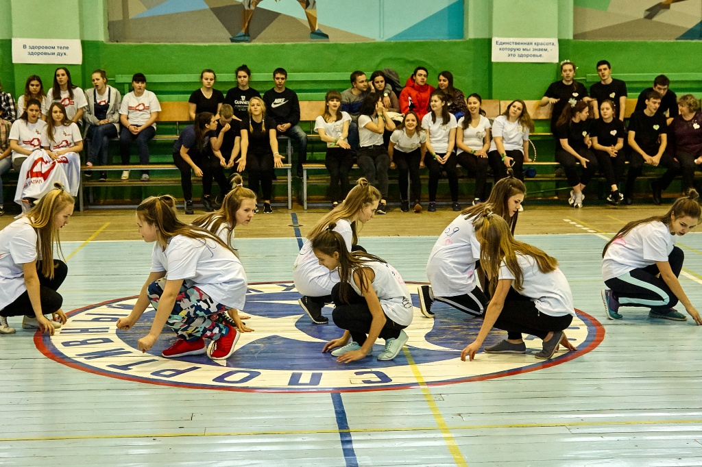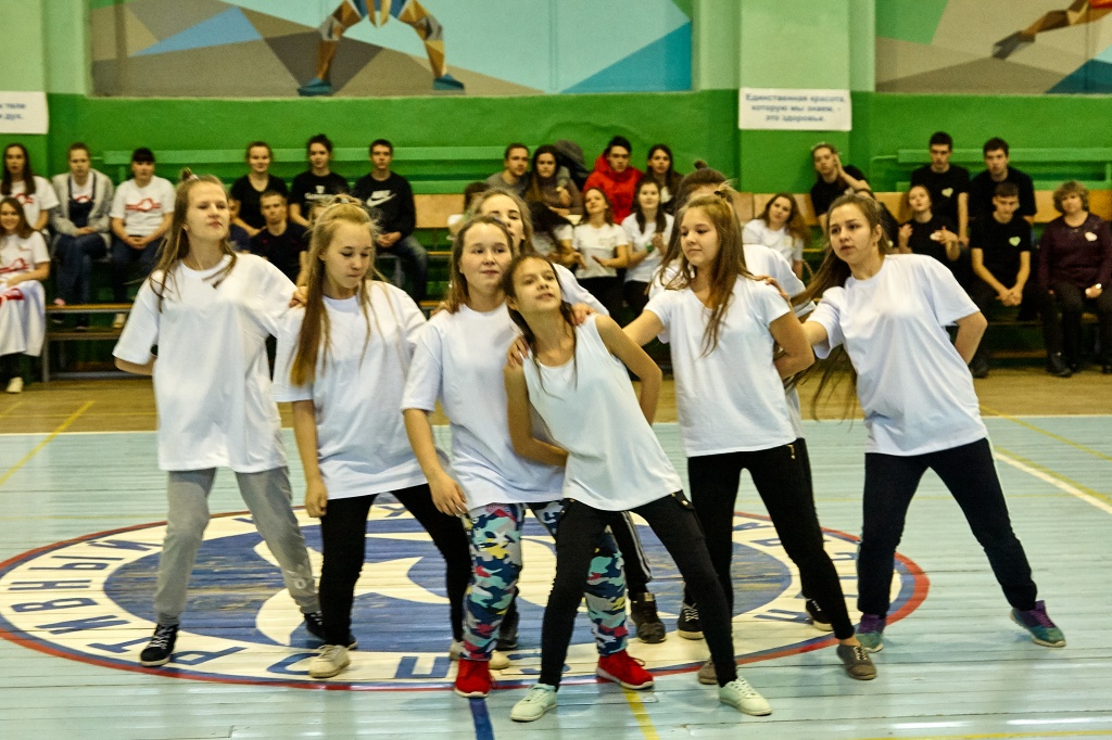 1-я часть – спортивно-оздоровительный танцевальный флэшмоб, который должны были представить команды-участники. Здесь оценивались и оригинальность идеи, и внешний вид участников, и синхронность исполнителей. Участники смогли удивить зрителей не только артистизмом, но и использованием в танцах разных акробатических приемов.