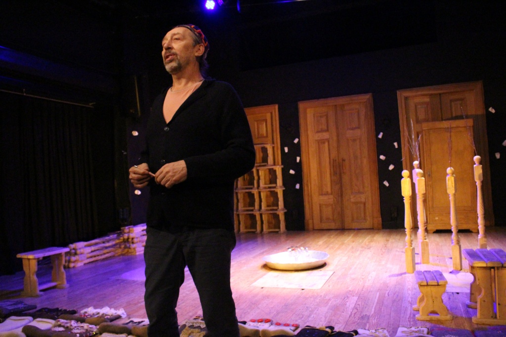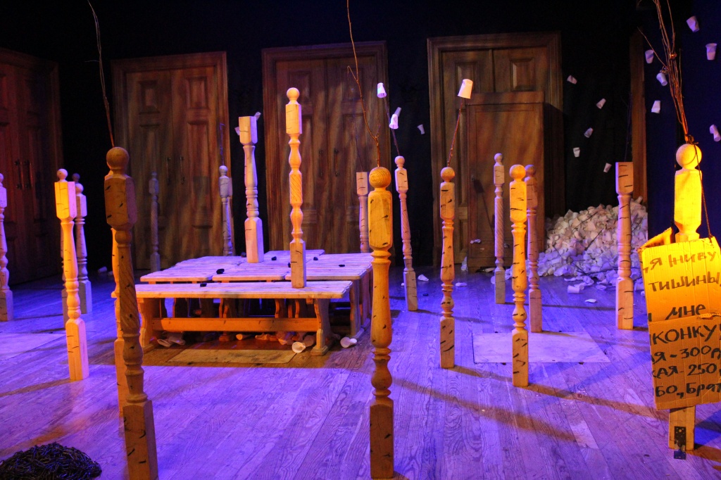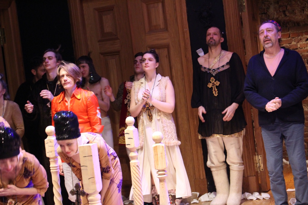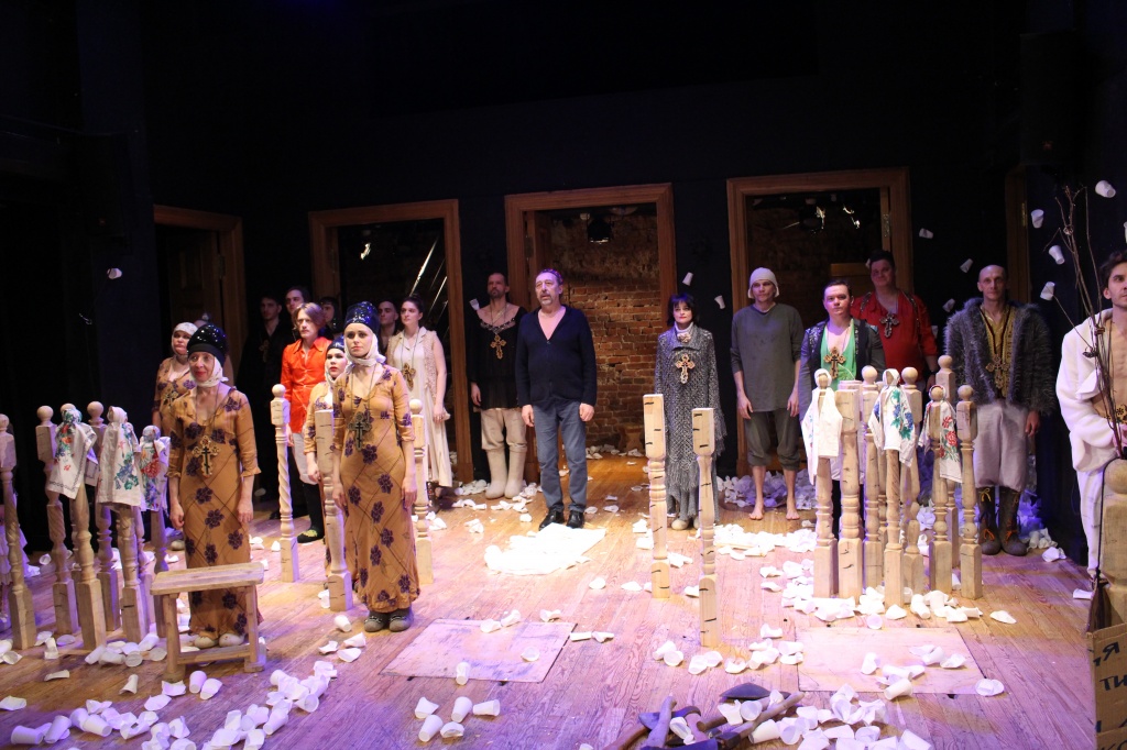 Спектакль решен в стилистике «а ля рюс» – герои наряжены в какие-то невообразимые расшитые стразами валенки, замотаны в вязаные крючком платки, непрерывно «гулевают», вместо цветущего сада – белые пластиковые стаканчики. Такое «осовременивание» и «объяснение» жизненных тягот и внутренней катастрофы персонажей классической пьесы, будь оно прямым, вряд ли вызвало бы желание показать спектакль студентам. Но, как всегда у Коляды, этот прием используется не до конца – нет перенесения в современность, условны костюмы, условен разгул.