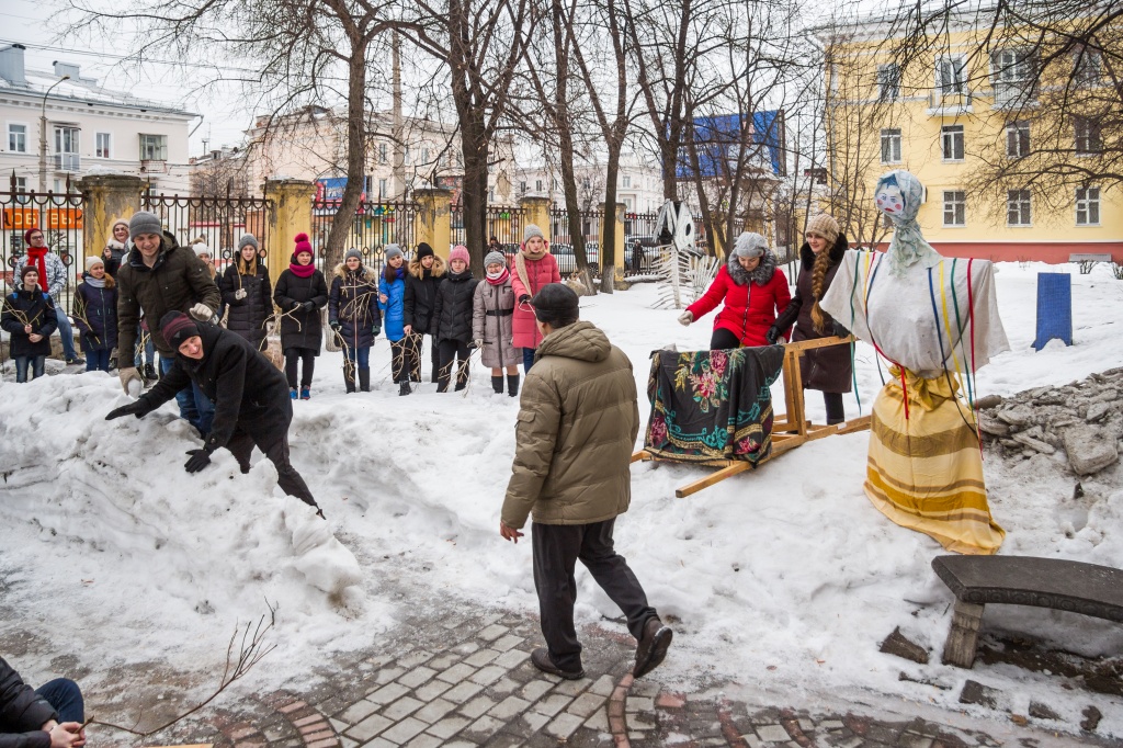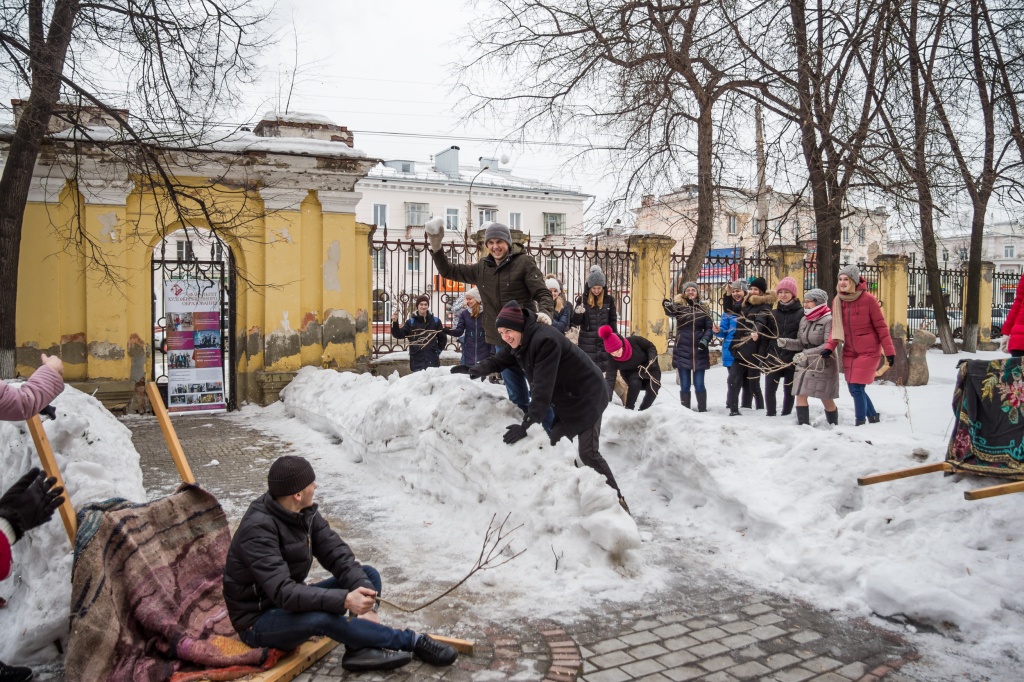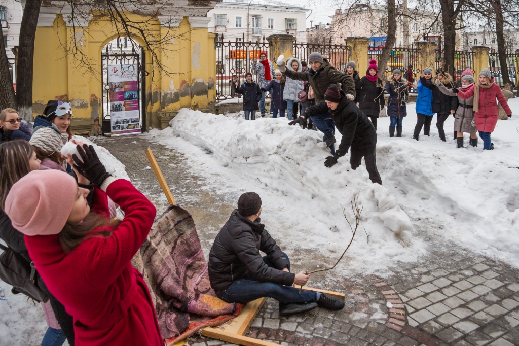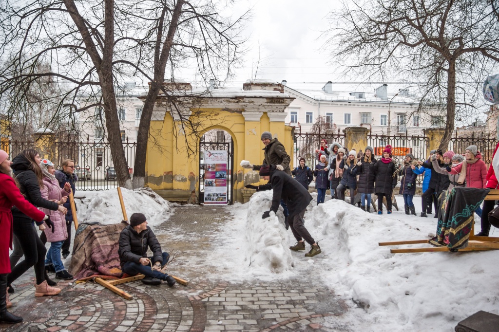 Начало проекта ("Остановись, мгновенье...": живописный хронотоп) – композиционная реконструкция знаменитой картины Василия Сурикова «Взятие снежного городка» в современном пространстве.