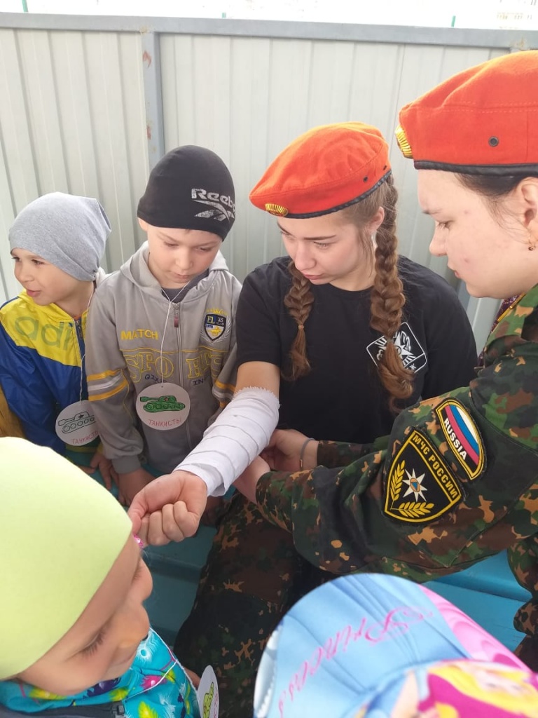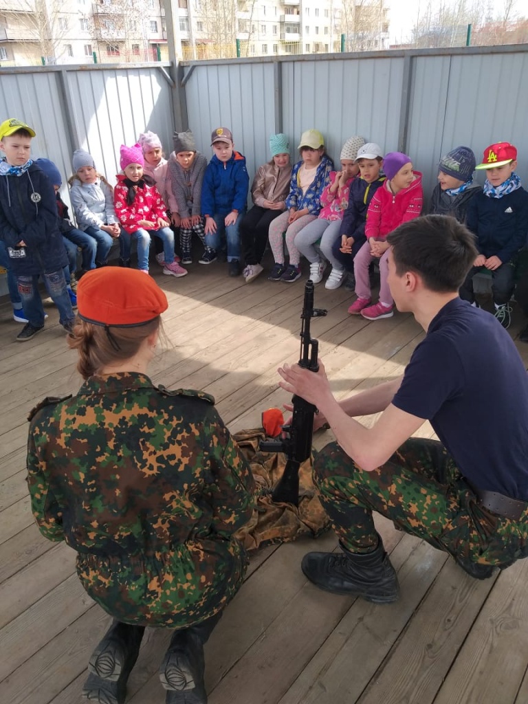 Данное мероприятие было приурочено к годовщине Победы в Великой Отечественной войне. Дети активно принимали участие в спортивных конкурсах и заданиях, посоревновались в перетягивании каната, определили, кто самый быстрый и ловкий, познакомились с устройством автомата Калашникова, узнали основы оказания первой помощи, попробовали наложить повязки.