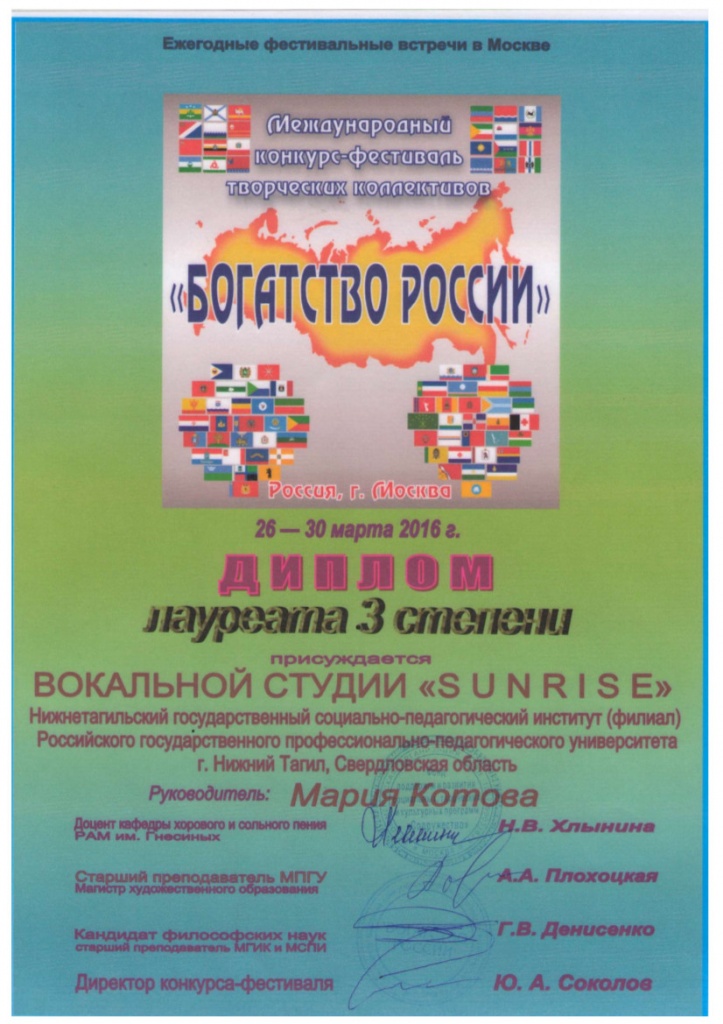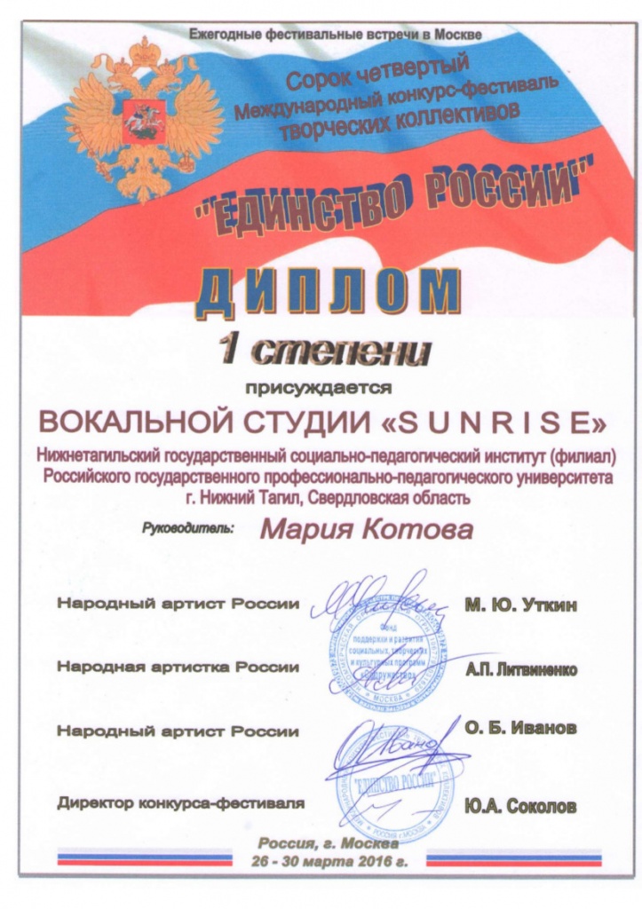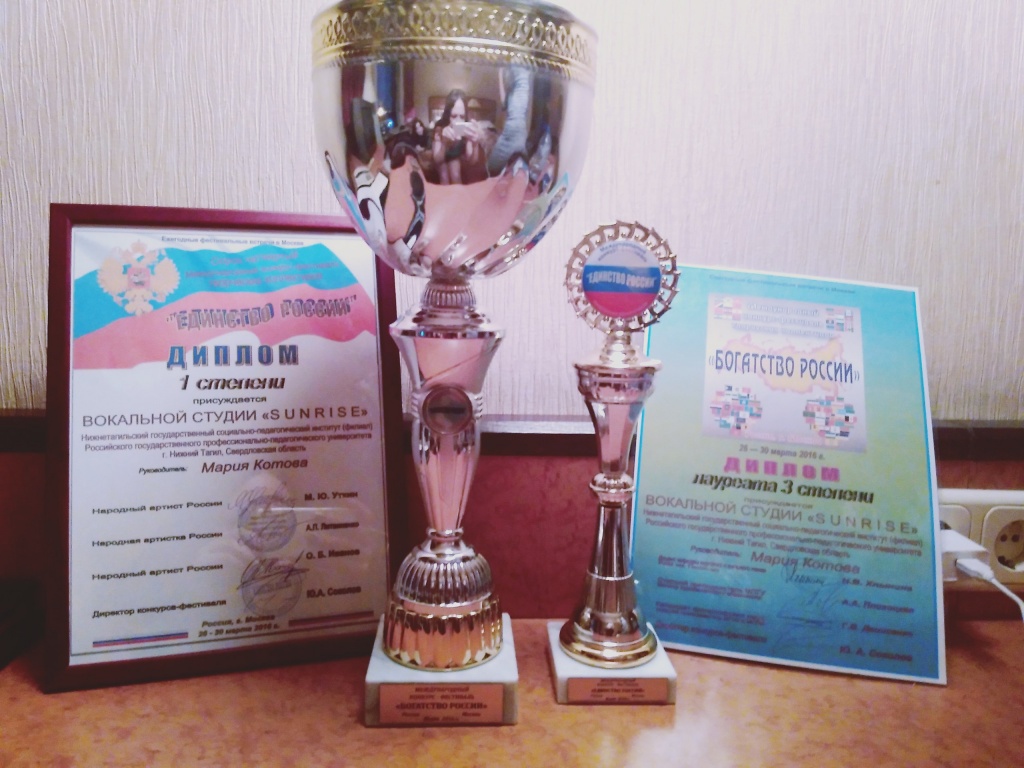 Мы поздравляем вокальную студию «Sunrise» с победами в 44-х международных встречах, конкурсах-фестивалях творческих коллективов «Единство России» и «Богатство России».