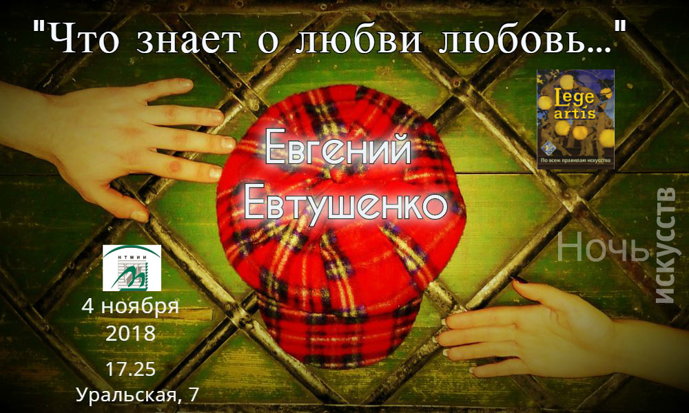 17.25 (площадка 3 – ул. Уральская, дом 7, 2 этаж): «Что знает о любви любовь…»: музыкально-поэтическая композиция по стихотворениям Евгения Евтушенко. Студенты 4 курса (профиль «Сценические искусства»);