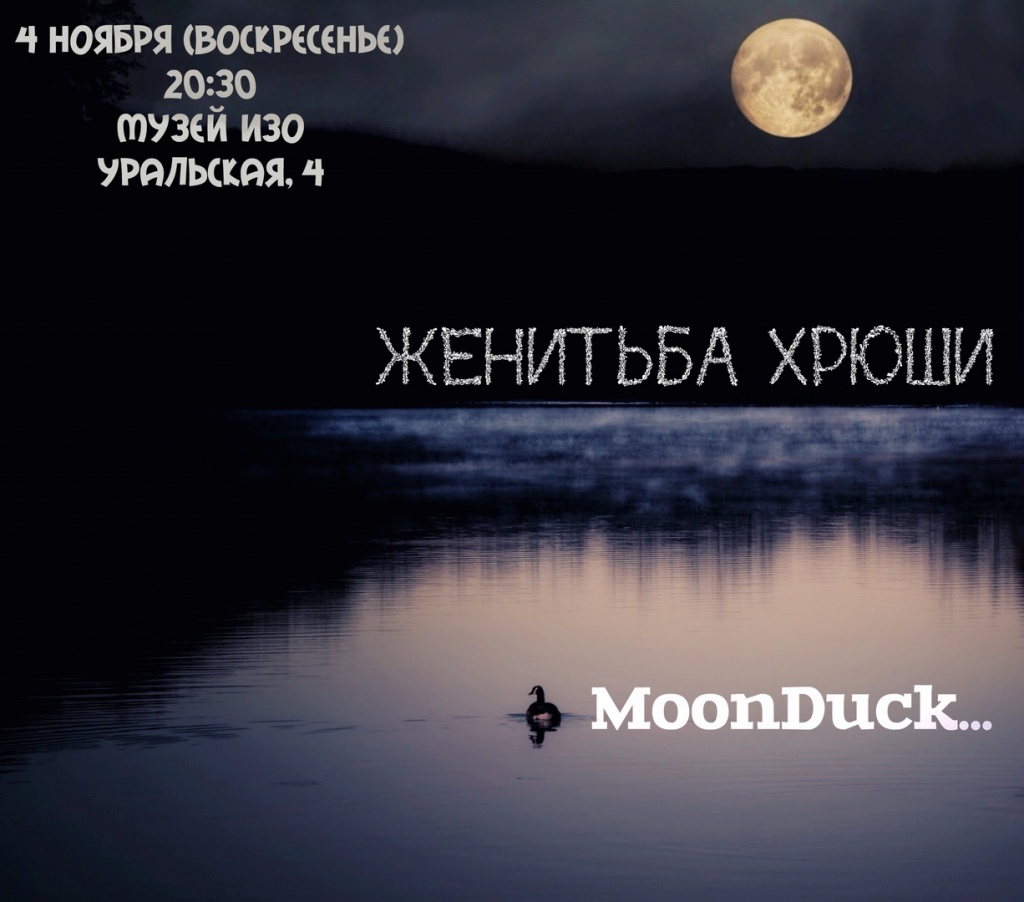 20.30 (площадка 7 «экспериментальная» – ул. Уральская, дом 4, 2 этаж): концертная программа «Лунная утка» группы «Женитьба ХрюШи» в рамках городской акции по созданию «стихийной» выставки «Девять тридцать три».