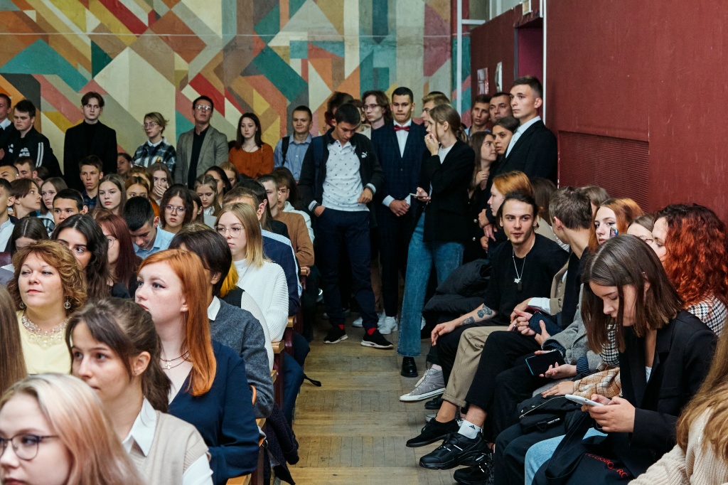 Перед первокурсниками социально-гуманитарного факультета сразу после торжественной линейки выступили сотрудники Нижнетагильского музея изобразительных искусств: Елена Александровна Устинова, канд. ист. наук, и Александра Львовна Шемякина, заведующая сектором городской скульптуры.