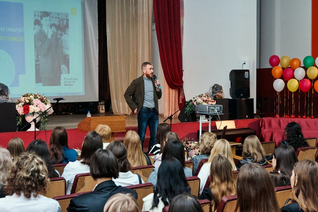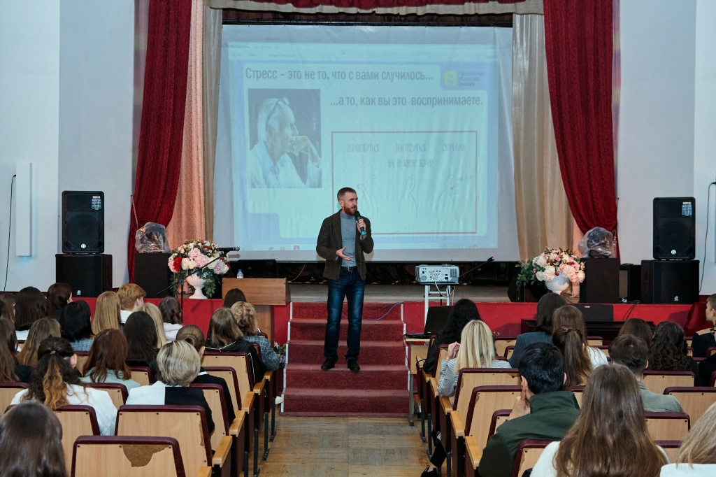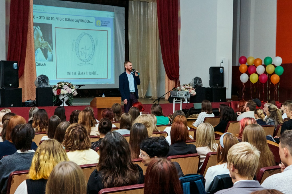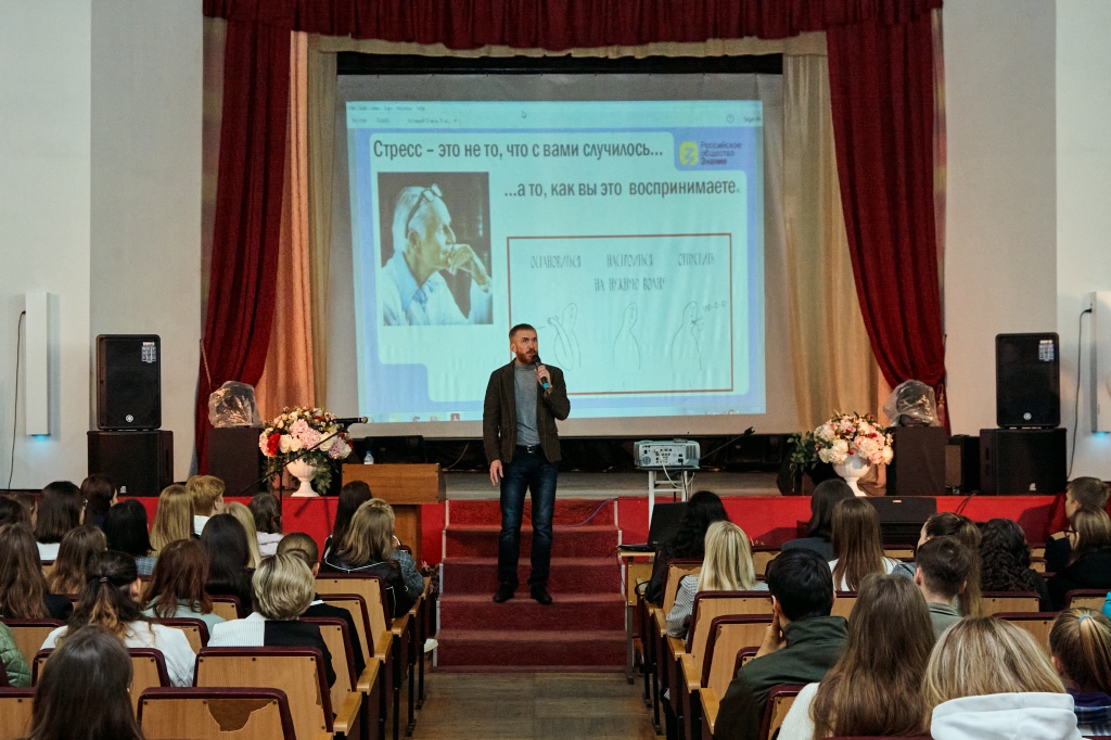 В актовом зале НТГСПИ площадка «Поделись своим знанием» принимала студентов четырех факультетов в два потока. Кандидат педагогических наук и лектор Российского общества «Знание» Станислав Сергеевич Луткин делился способами преодоления стресса в насыщенной событиями студенческой жизни.