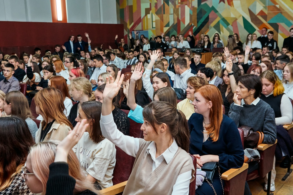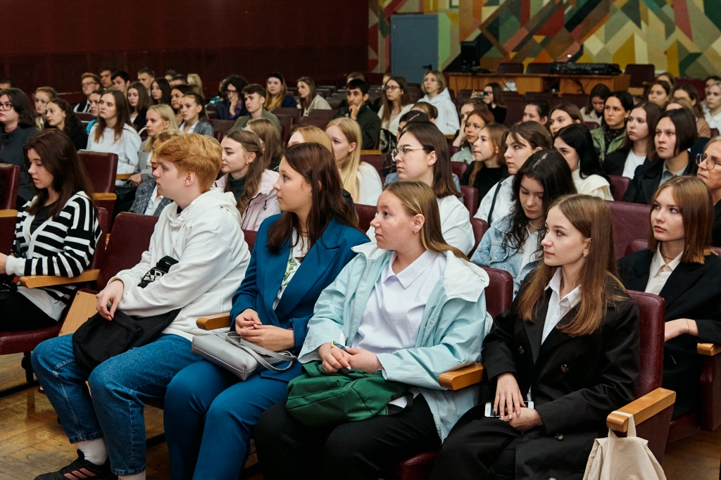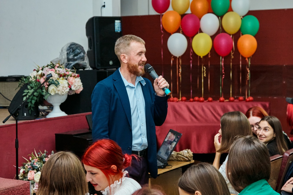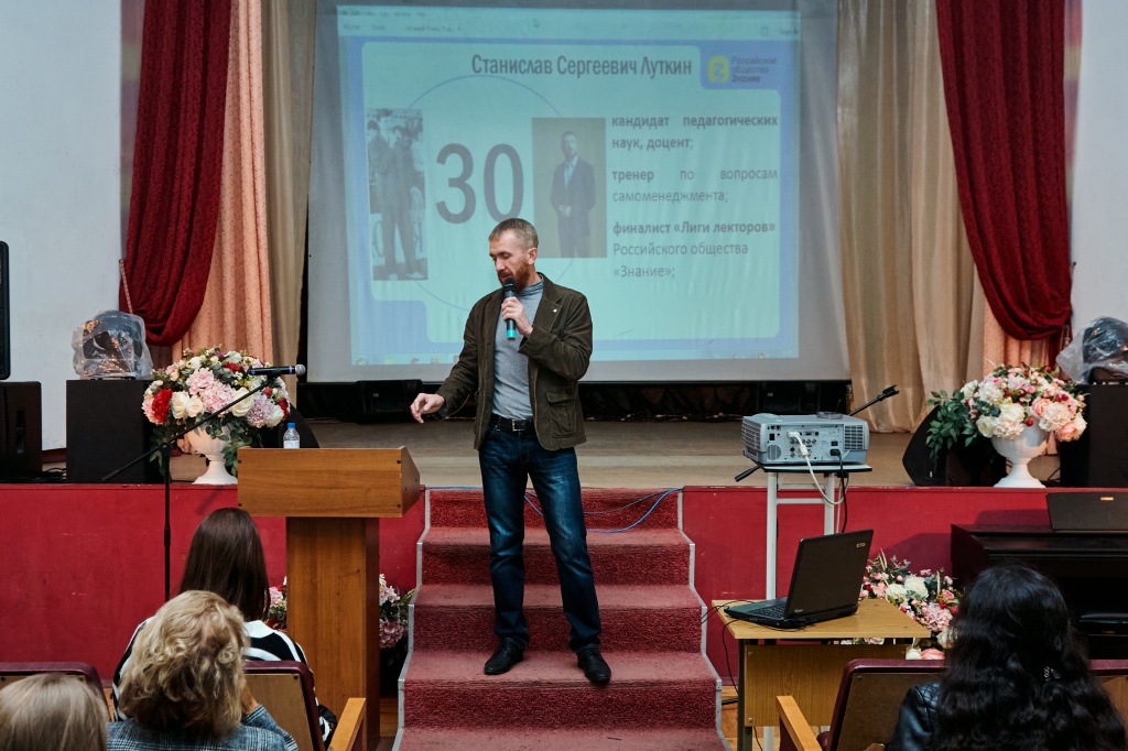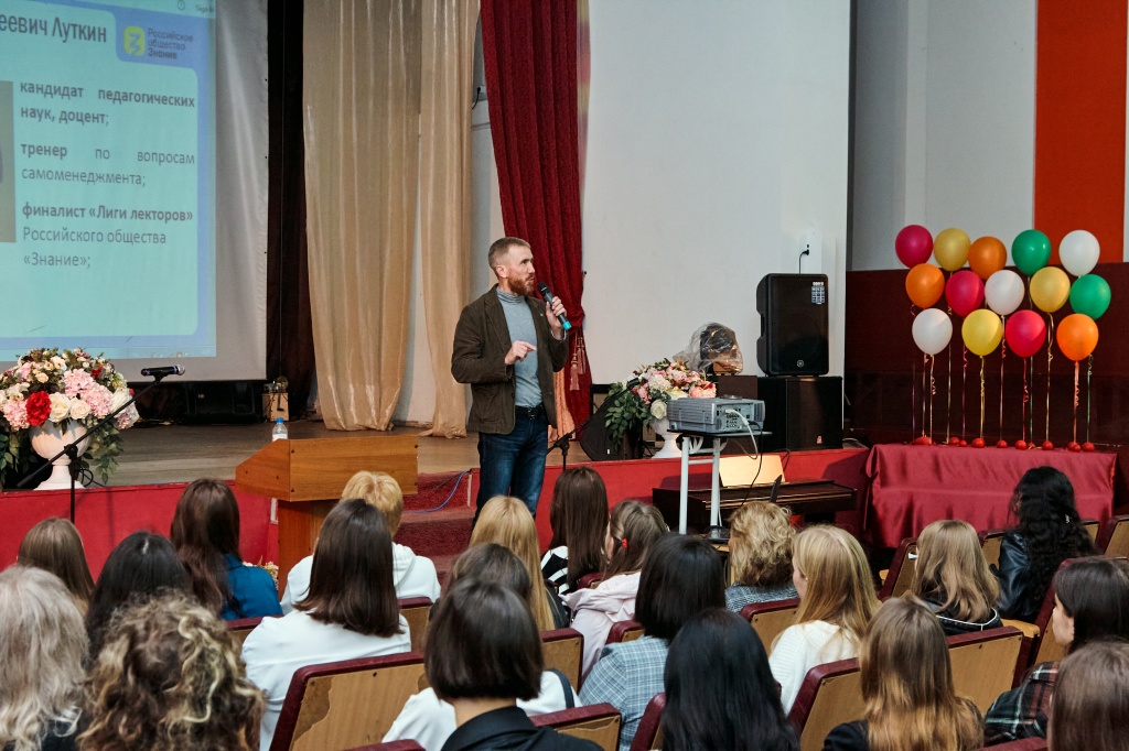 В актовом зале НТГСПИ площадка «Поделись своим знанием» принимала студентов четырех факультетов в два потока. Кандидат педагогических наук и лектор Российского общества «Знание» Станислав Сергеевич Луткин делился способами преодоления стресса в насыщенной событиями студенческой жизни.