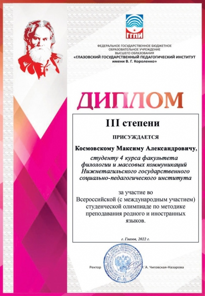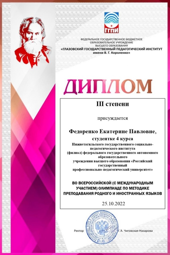 25 октября 2022 года кафедра иностранных языков и удмуртской филологии ФГБОУ ВО «Глазовский государственный педагогический институт им. В.Г. Короленко» провела Всероссийскую (с международным участием) студенческую олимпиаду по методике преподавания родного и иностранных языков.