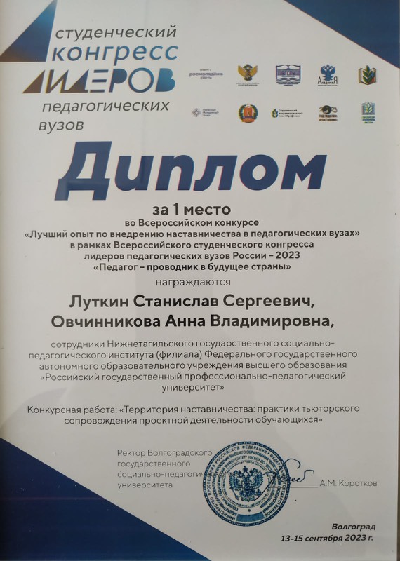 В рамках Конгресса состоялся Всероссийский конкурс «Лучший опыт по внедрению наставничества в педагогических вузах». По результатам конкурса первое место получили Станислав Сергеевич Луткин, доцент кафедры психологии и педагогики, и Анна Владимировна Овчинникова, старший преподаватель кафедры безопасности жизнедеятельности и туризма с проектом «Территория наставничества: практики тьюторского сопровождения проектной деятельности обучающихся». Нашим студентам было почетно представлять наш вуз на таком масштабном образовательном мероприятии в Год педагога и наставника.
