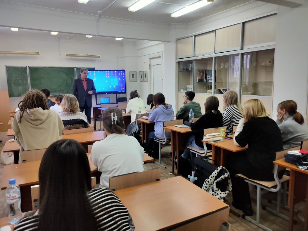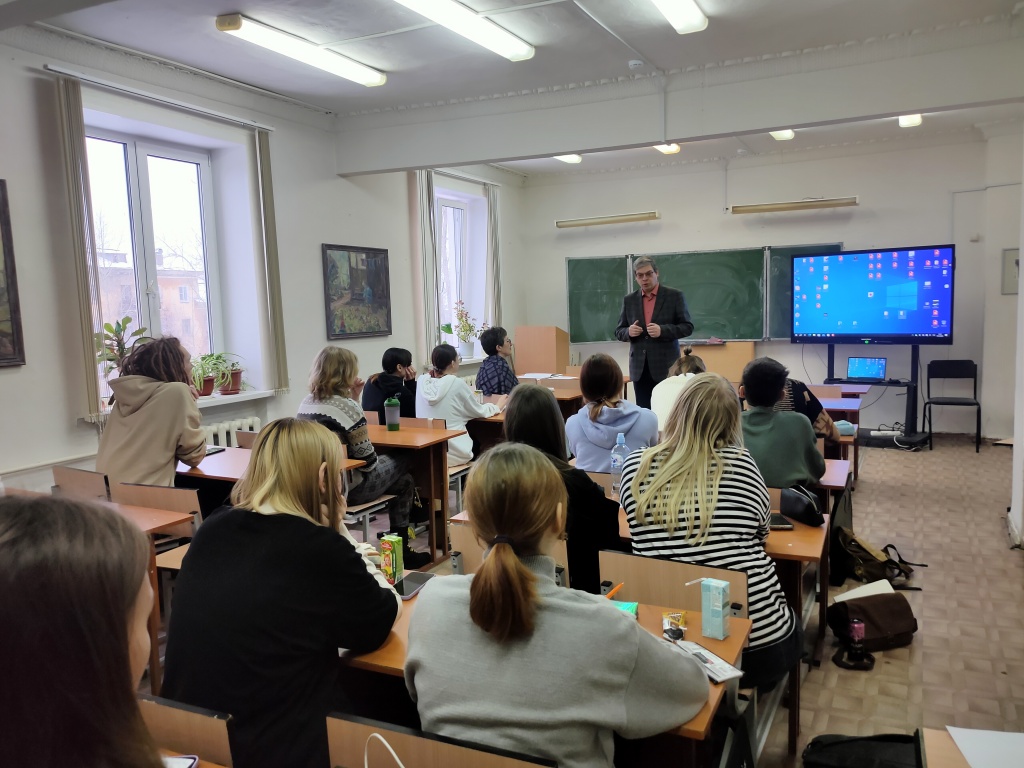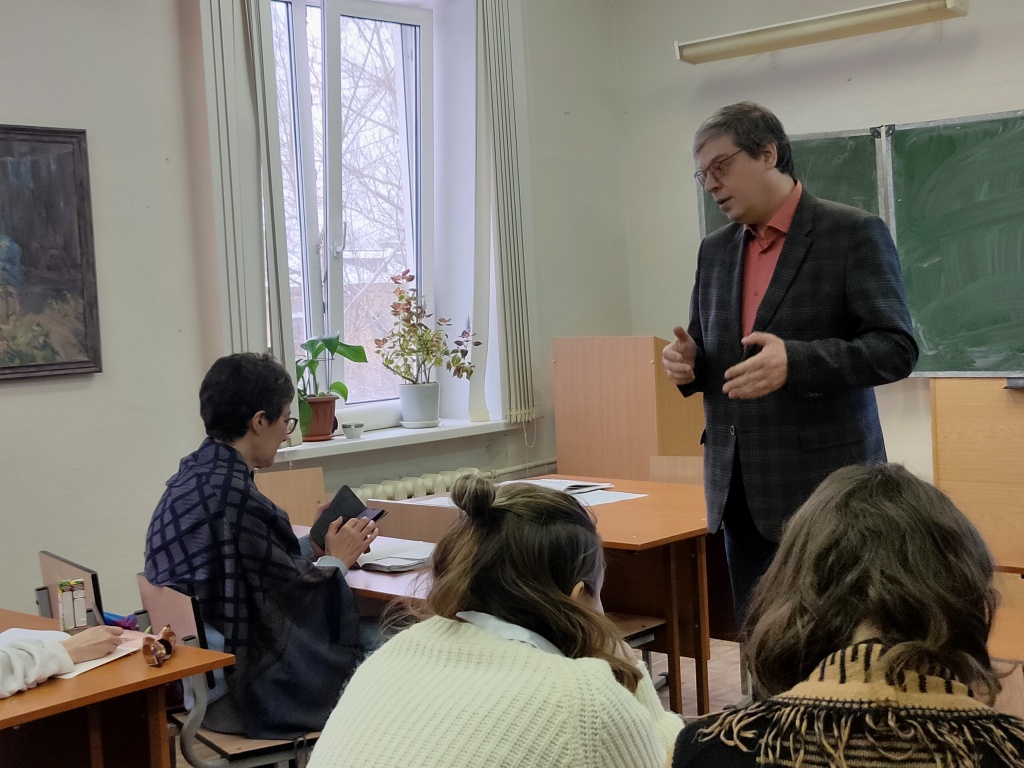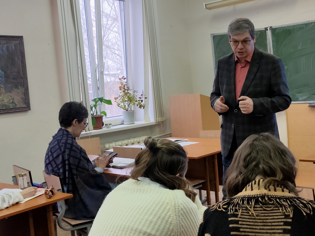 В декабре 2024 г. на ФХО состоялась беседа-практикум «Культура речи студента педагогического вуза». Студенты 1 и 5 курсов имели возможность поговорить о выразительности русской речи с кандидатом филологических наук, доцентом кафедры русского языка ФГБОУ ВО «Российский государственный педагогический университет им. А. И. Герцена» (г. Санкт-Петербург) Алексеем Ивановичем Дуневым.