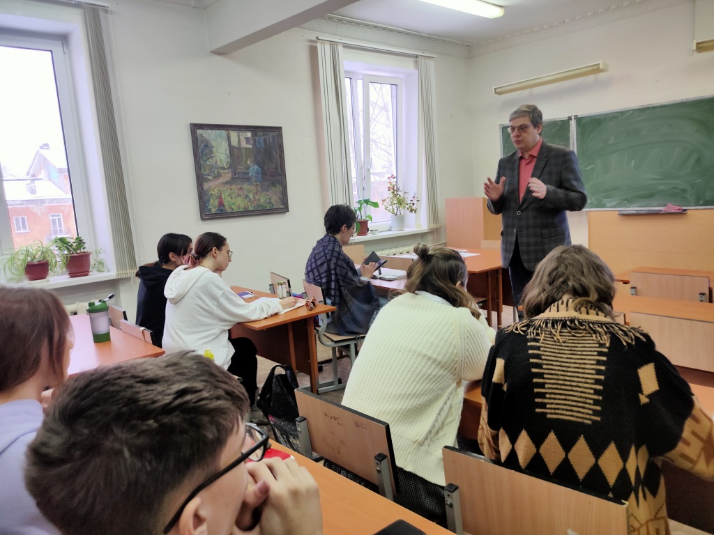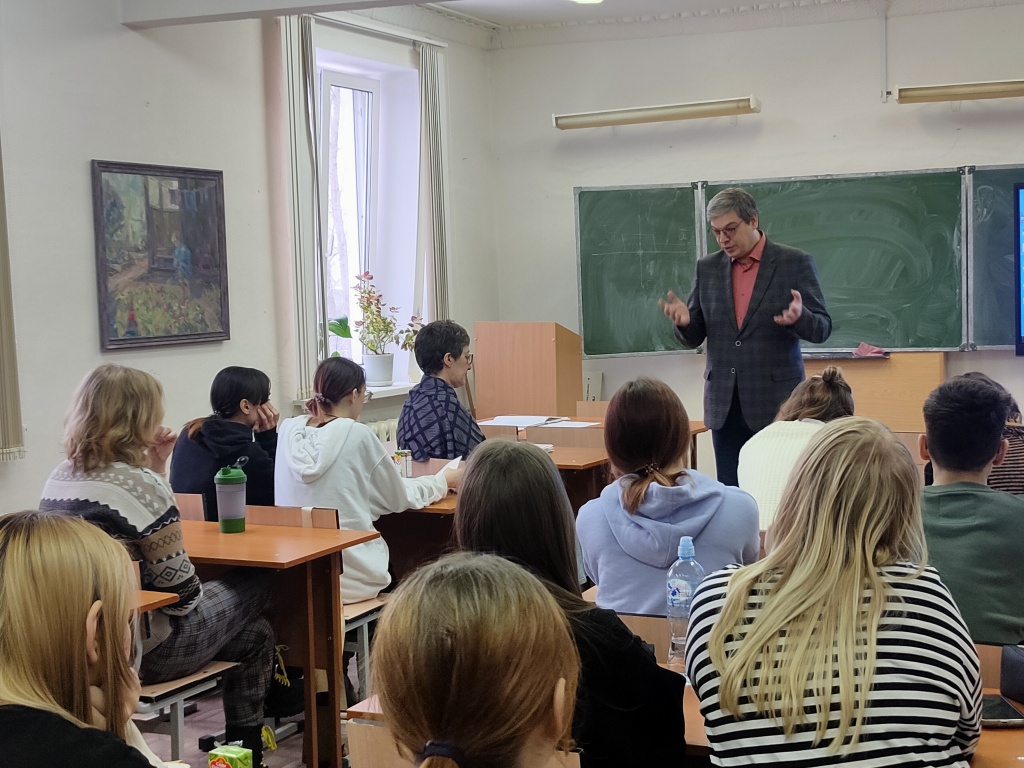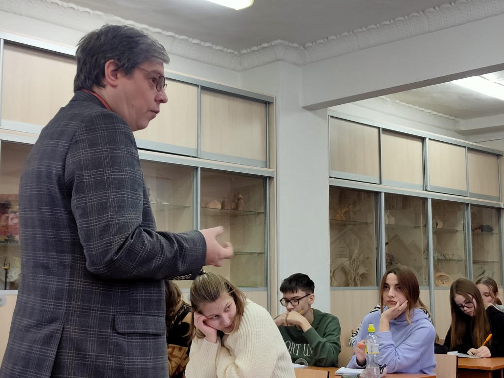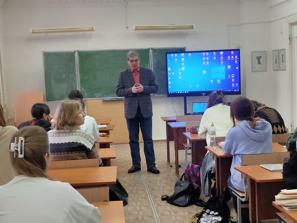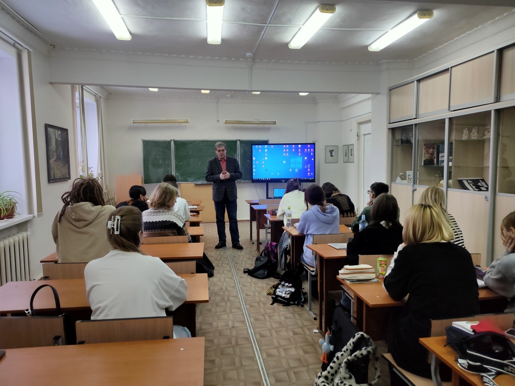 В декабре 2024 г. на ФХО состоялась беседа-практикум «Культура речи студента педагогического вуза». Студенты 1 и 5 курсов имели возможность поговорить о выразительности русской речи с кандидатом филологических наук, доцентом кафедры русского языка ФГБОУ ВО «Российский государственный педагогический университет им. А. И. Герцена» (г. Санкт-Петербург) Алексеем Ивановичем Дуневым.
