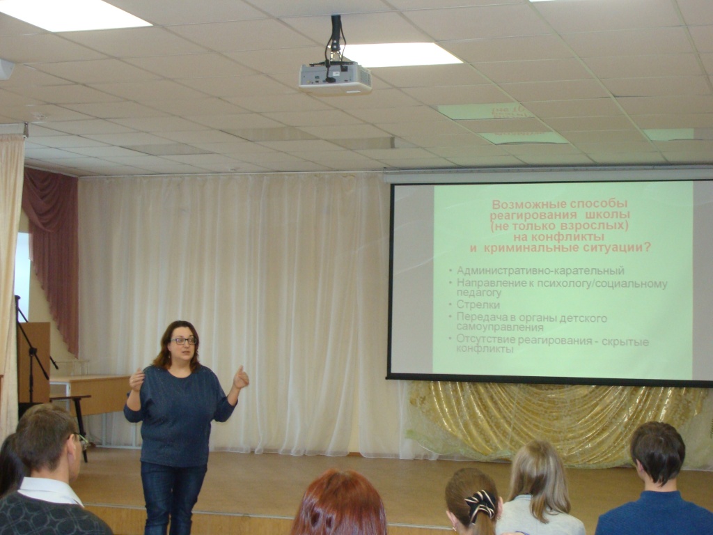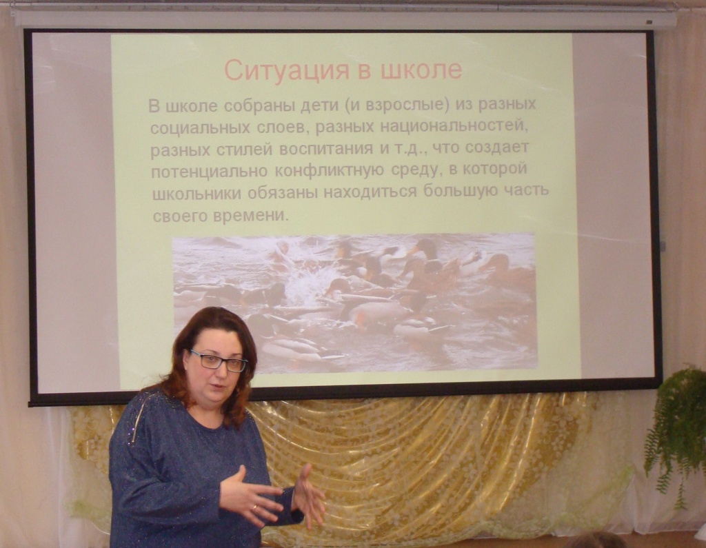 Ирина Владимировна Култышева подробно рассказала участникам семинара о конфликтах, которые могут произойти в образовательном учреждении, возможных способах их решения, а также о школьной службе примирения, целью создания которой является улучшение отношений в школе между участниками образовательного процесса, а также содействие организации психологически безопасной среды в школе.