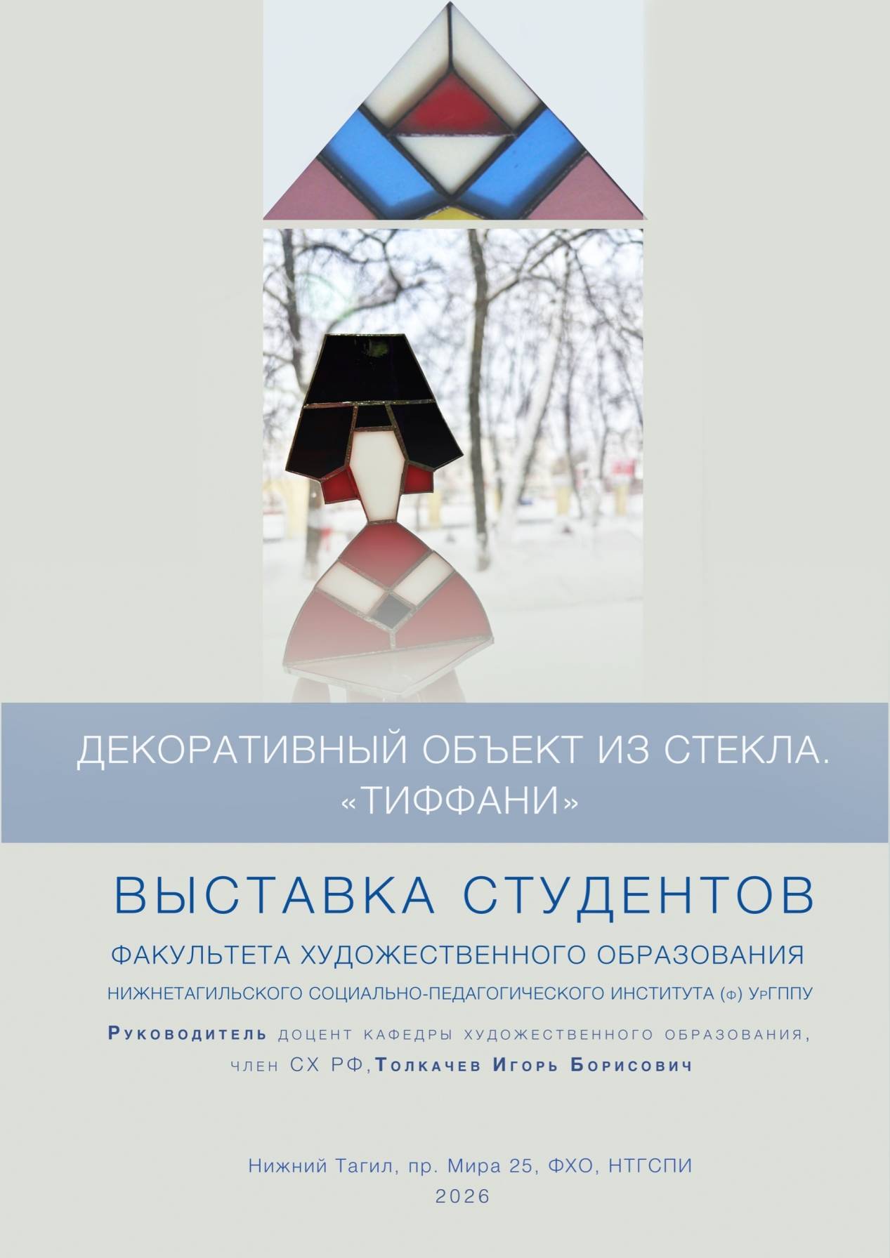 Творческие работы студентов 5 курса кафедры художественного образования составляют основу выставки «Декоративный объект из стекла „Тиффани”», выполненных под руководством преподавателя кафедры художественного образования Игоря Борисовича Толкачева.