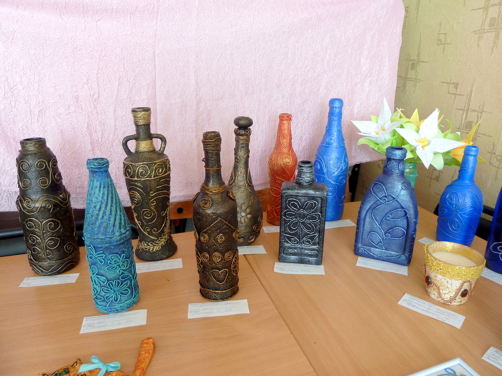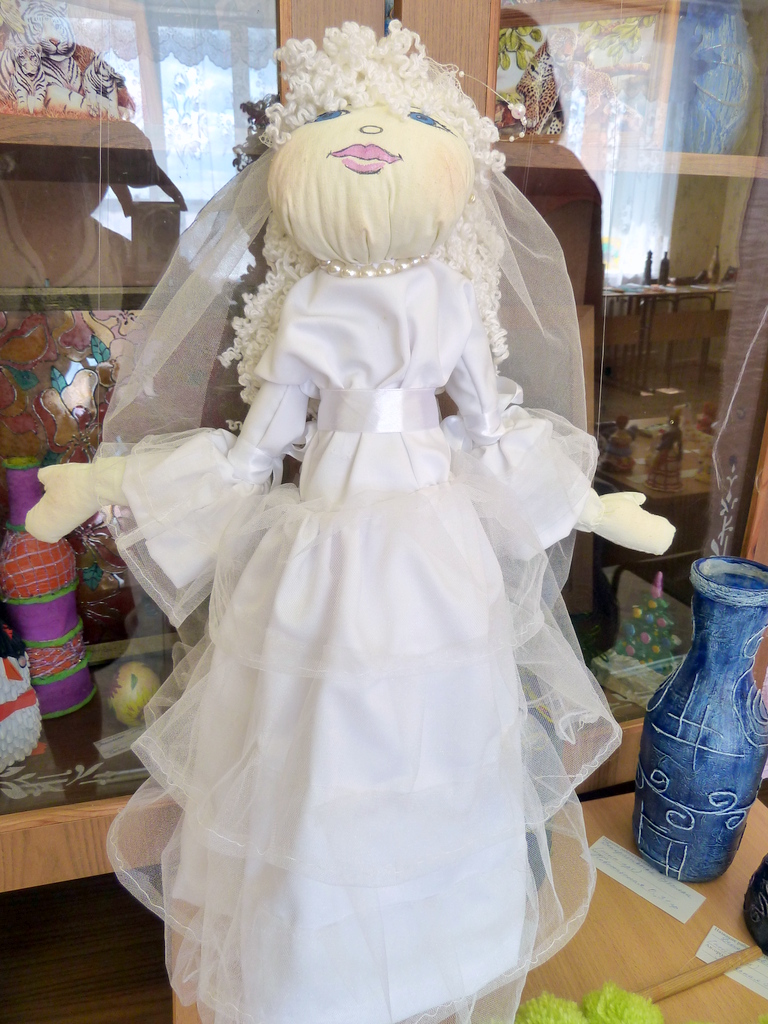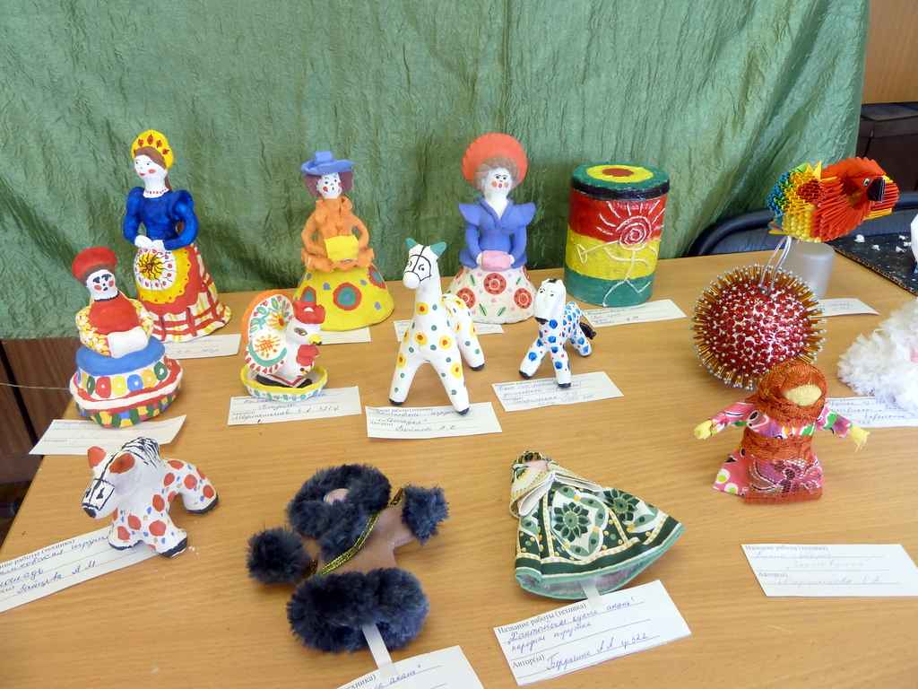 На выставке представлены более ста экспонатов: объемные картины из бумаги, декоративные панно, бутылки и шкатулки, национальные куклы, обереги, куклы-марионетки, мягкие игрушки, дымковские и абашевские глиняные игрушки, куклы для пальчикового театра и др.