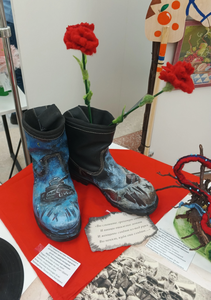 На выставке было представлено множество работ на военную тематику (модели и макеты техники) и композиций, выполненных в различных техниках (вышивка, работа с природным материалом, роспись по ткани, роспись по коже, вышивка крестом, художественная обработка бумаги, смешанная техника).