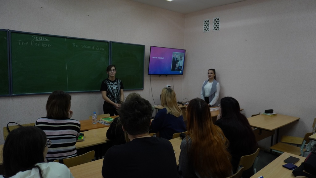 Изучение английского языка – это не только грамматика, но и погружение в англоязычную среду, возможность общаться на любые темы. Квиз-игра состояла из пяти категорий, где студенты разгадывали англоязычные медиа, объясняли мемы на английском языке, старались правильно произносить знаменитые бренды, объяснять значение идиом для повседневного общения и угадывали страну по стереотипным песням. Студенты разделились на две команды и проявляли активность на протяжении всего мероприятия.