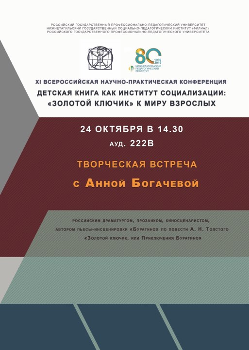 С 14.30 до 16.00 пройдет творческая встреча с Анной Богачевой, российским драматургом, прозаиком, киносценаристом, автором пьесы-инсценировки «Буратино» по повести А. Н. Толстого «Золотой ключик, или Приключения Буратино» (ауд. № 222В).