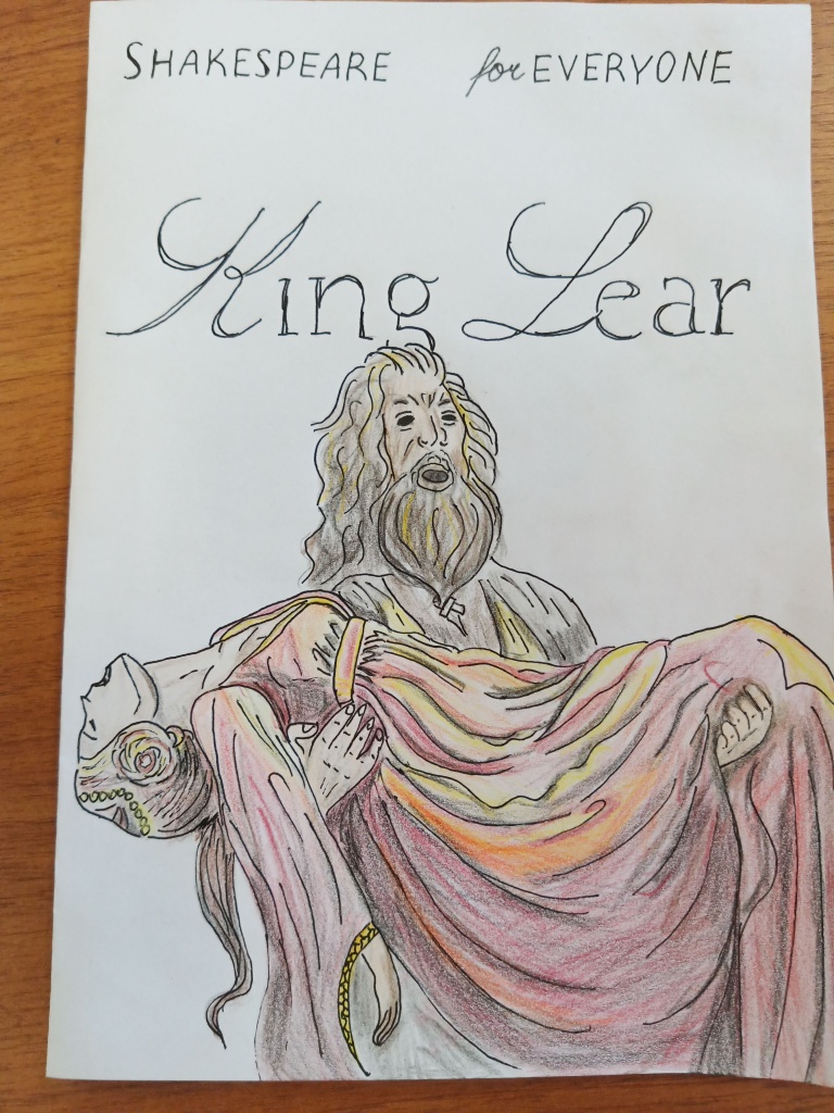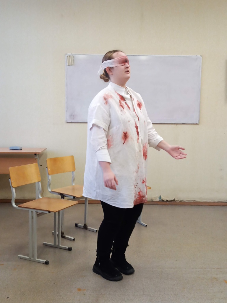 На следующий день «шекспировскую эстафету» продолжила группа Нт-205о РЛТ. Девочки пошли по другому пути: они представили своеобразный дайджест одной великой трагедии – «Короля Лира», вместив примерно в 20 минут основное содержание произведения. Студенты сумели раскрыть образы персонажей, насколько это возможно для подобной скоротечной постановки. Все были органичны, просто у кого-то было чуть больше сценического времени, у кого-то меньше. Убедителен был и король Лир (Анастасия Мурашова), переживший предательство старших дочерей и смерть несправедливо изгнанной Корделии и его дочери: сладкоречивая и коварная Гонерилья (Екатерина Наймушина), жесткая Регана (Юлия Бурухина), искренняя, любящая Корделия (Ольга Савыкова). Эмоционален Кент (Марина Алешина), эксцентричен шут (Яна Третьяк). Но особенно впечатлило решение одной из самых трагических сцен – ослепление Глостера. Анастасии Ясыревой удалось передать трагизм этого героя.