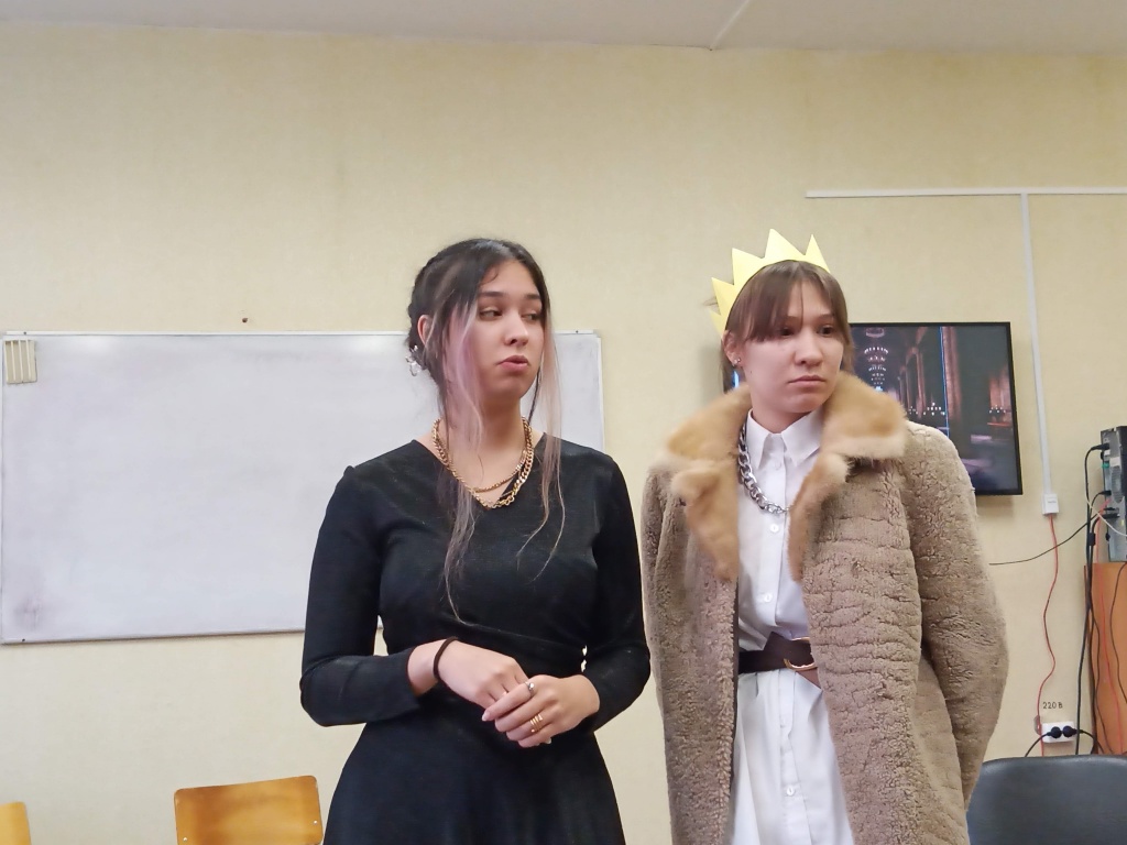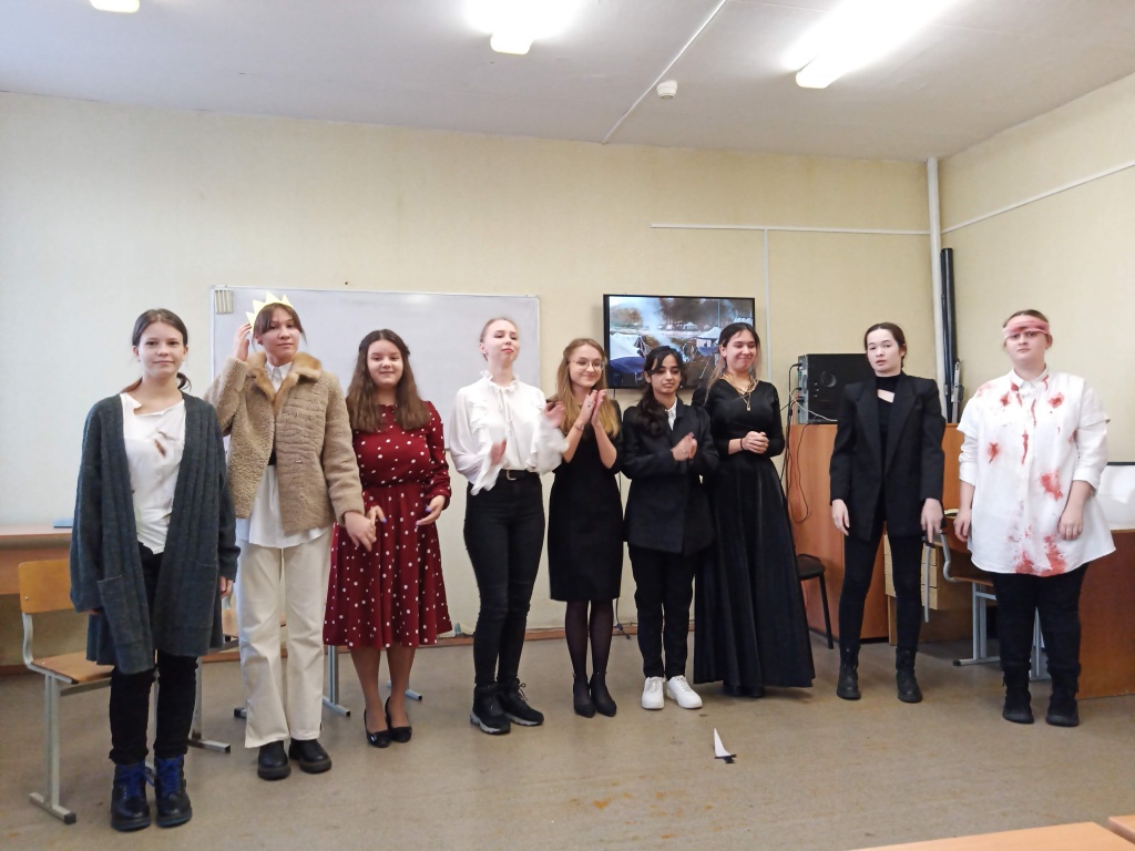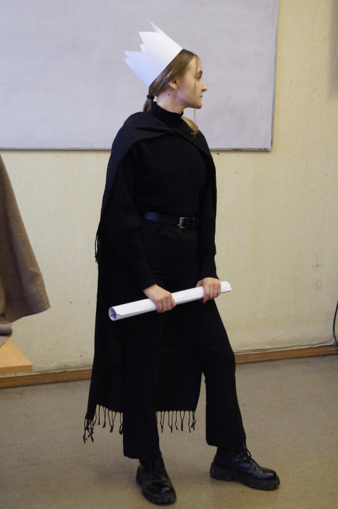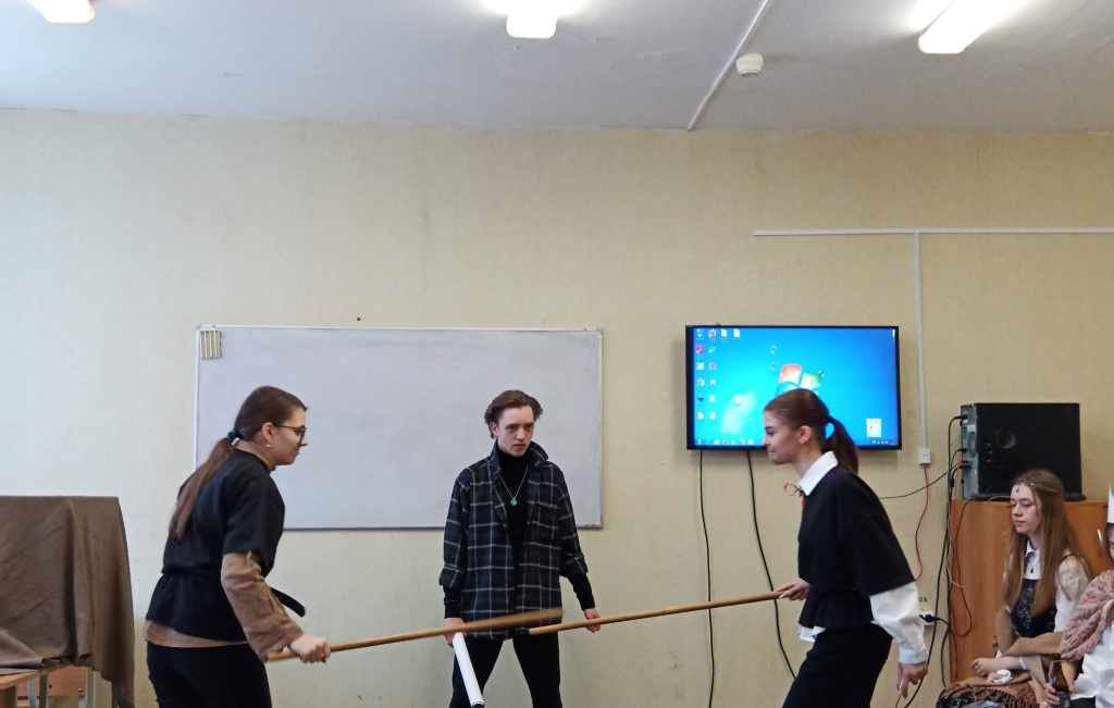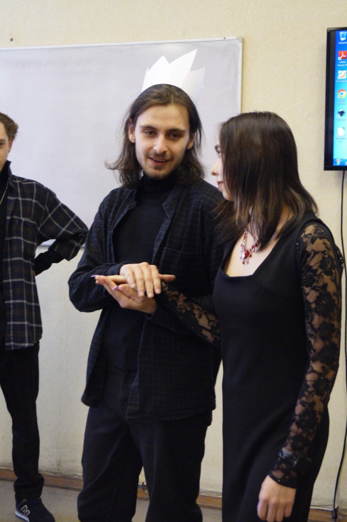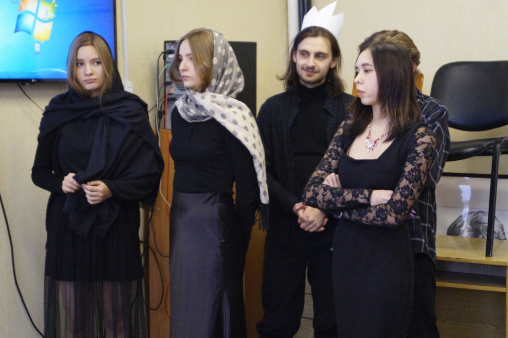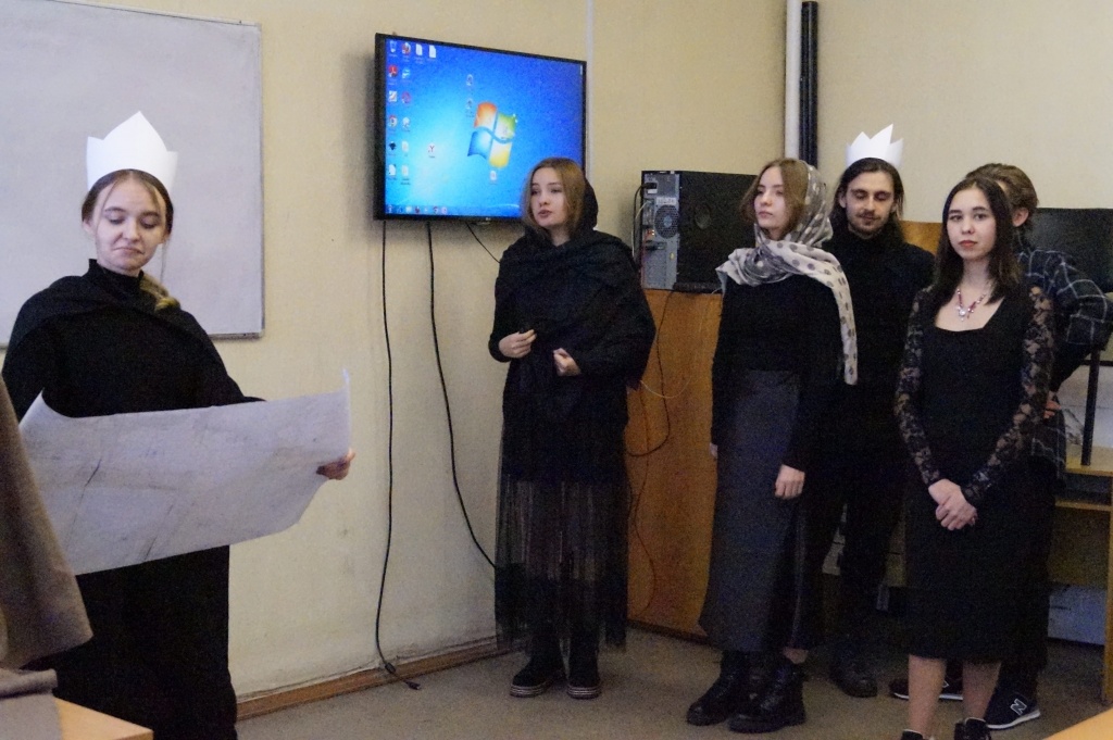 5 и 6 декабря на факультете филологии и межкультурной коммуникации на занятиях по зарубежной литературе студенты групп Нт-201о ФДО и Нт-205о РЛТ показали свои варианты инсценировок произведений Шекспира. Группа Нт-201о ФДО представила отдельные сцены из известных трагедий английского драматурга – «Король Лир», «Гамлет», «Ромео и Джульетта». При этом представление сопровождалось комментарием ведущей – Екатерины Кузнецовой. Студенты пытались максимально вжиться в предложенные образы, подобрали реквизит, костюмы. Особенно хотелось бы отметить трансформацию хрупкой Марии Силиной в короля Лира. Впечатлили присутствующих нежная Джульетта (Ксения Анисимова) и пылкий Ромео (Юлия Симакова). Интересно была исполнена и сцена дуэли Гамлета (Анастасия Духтанова) и Лаэрта (Агата Королева).