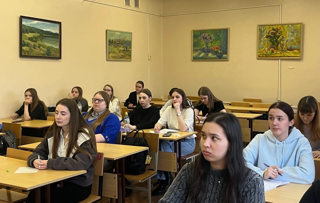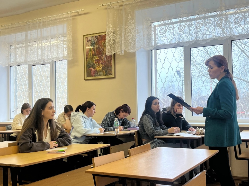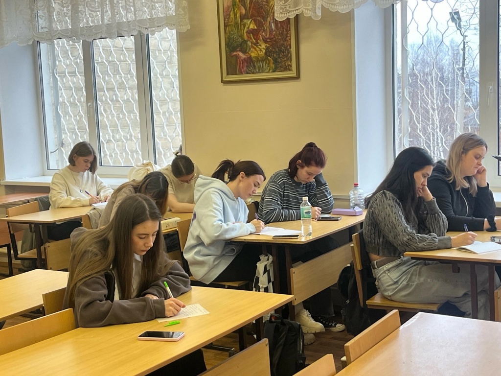 На занятии студенты как обычно познакомились с «правилом дня»: узнали об особенностях постановки знаков на стыке двух союзов. Также слушатели курсов узнали еще несколько важных правил: написание слов со строчной и заглавной буквы, обособление деепричастных оборотов и многие другие. После того как студентами был написан тренировочный диктант, текст его был проанализирован с точки зрения орфографических и пунктуационных затруднений. Также были рассмотрены вариативные случаи постановки знаков препинания в предложении.