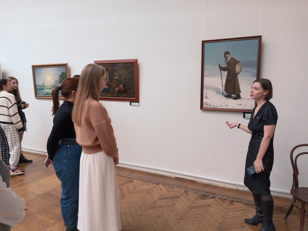 Экскурсовод Ксения Баданина – сама выпускница факультета русского языка и литературы НТГСПИ – с большим воодушевлением рассказала об экспонатах, об истории их появления в Нижнем Тагиле и о самом музее. Все картины были представлены из фондов музея. Часть экспонатов не до конца атрибутирована, но это не уменьшает их ценности. Особенно заинтересовала экскурсантов работа польского художника Яна Стыки «Толстой – странник. По дороге в бесконечность». Картина создавалась художником заочно, скорее всего по известной фотографии.