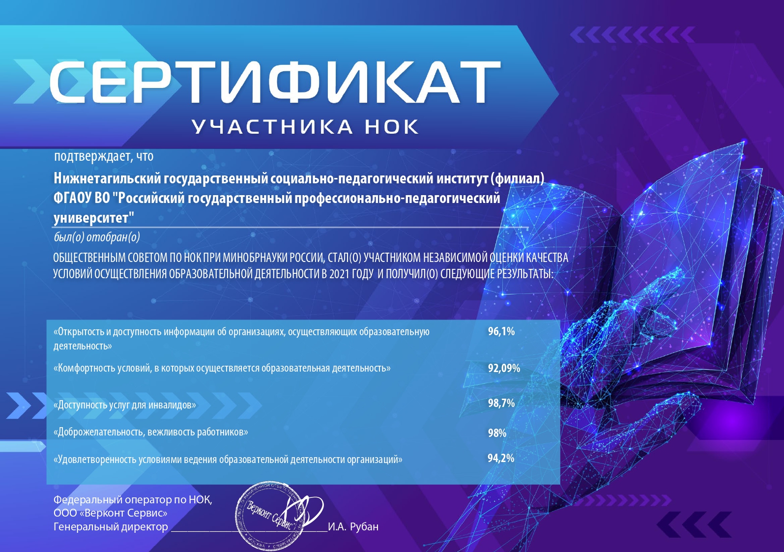 Результаты свидетельствуют о высокой оценке профессионализма работников института, вклада каждого из них в процесс качественной подготовки высококвалифицированных специалистов, создание современной и доступной образовательной среды, формирование открытой информационной среды, обеспечивающей информационное взаимодействие со всеми субъектами образовательной деятельности.